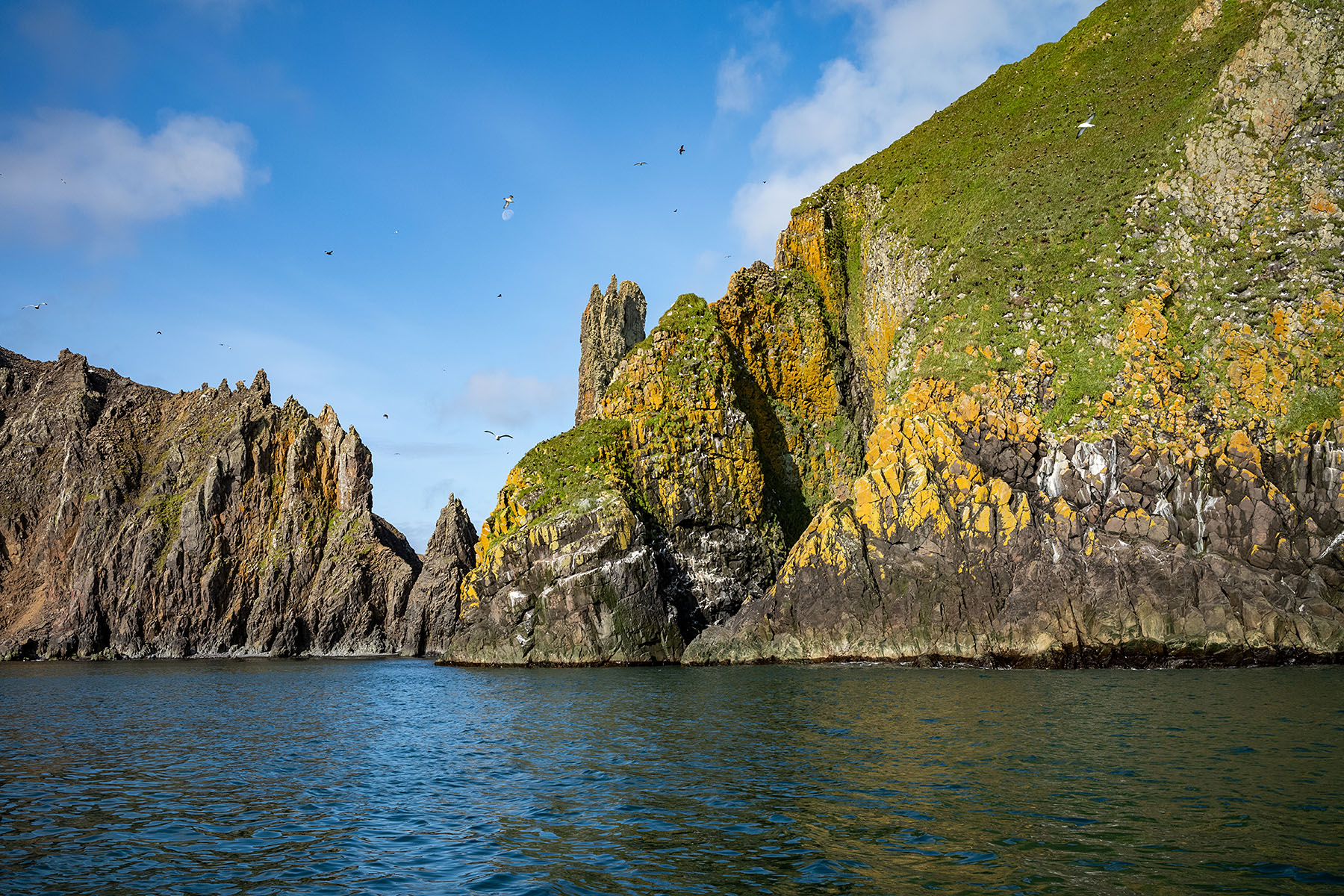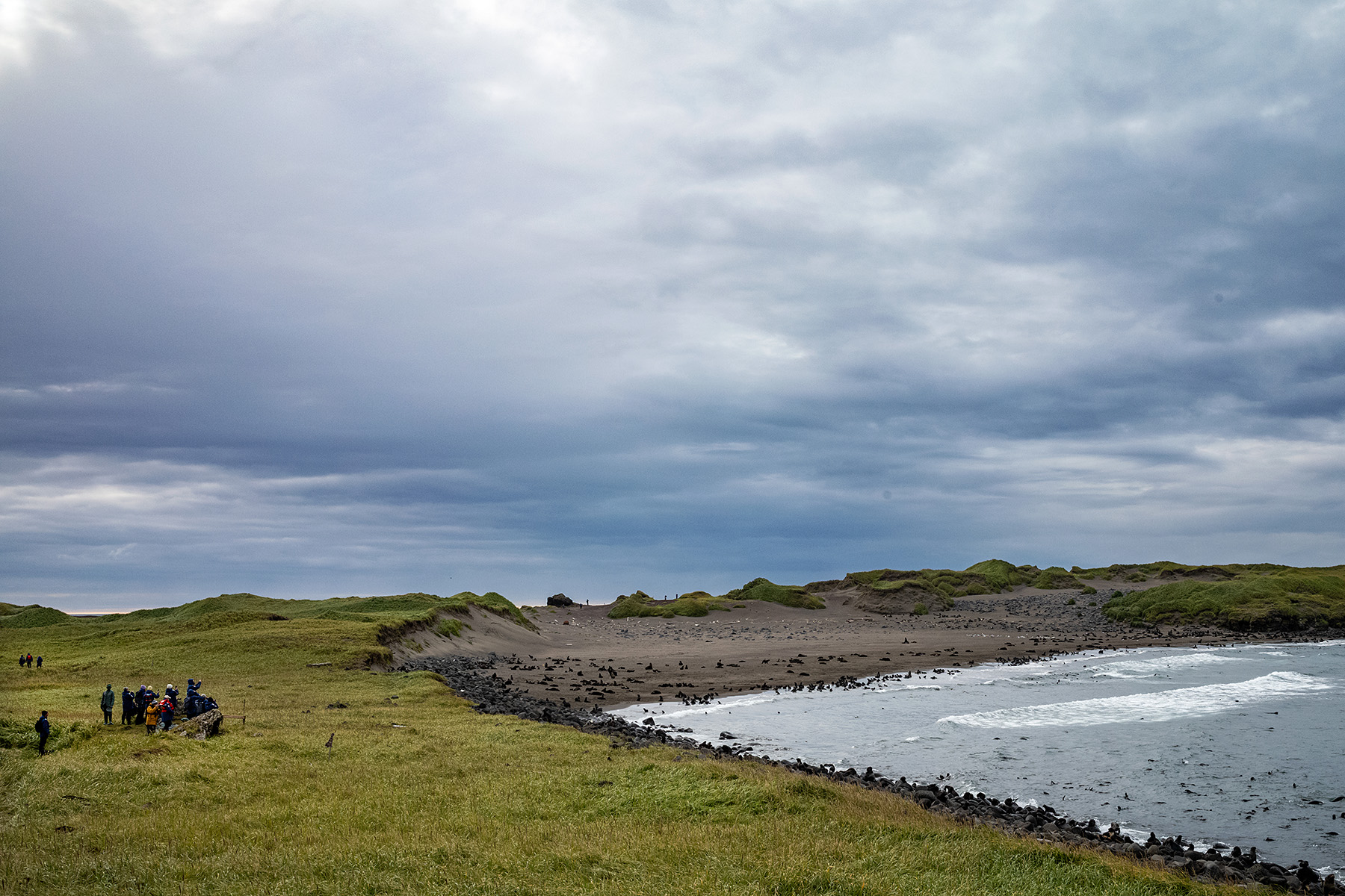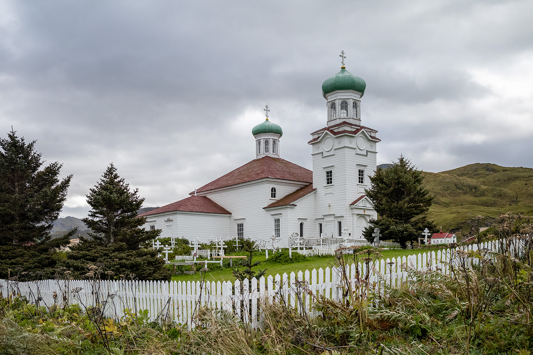 Verbesserung zu gestern: die Kormorane sind Lummen. Heute gab es einen Ausflug zur St.Paul Island, eine der Pribilof-Inseln. Heute sind wir trocken per Schlauchboot in einem Hafen angelandet (der Hafen ist für so große Schiffe natürlich zu klein, die müssen außerhalb „parken“). Die Gummistiefel waren trotzdem Pflicht, weil man auf dieser Insel keine Samen oder Steinchen oder Sonstiges mit den Schuhen oder der Überbekleidung einschleppen darf. Also dann halt wieder die Stiefel. Im Ort leben heute 400 sogenannte Aleuten, die irgendwie von den Russen abstammen. Alaska und diese Inselgruppe der Aleuten gehörten ja bis 1867 zu Russland, die das Land wegen Geldmangel an die USA verkauft haben. Es gibt eine geschlossene Kirche, weil sie keinen Pfarrer finden. Ein geöffnetes Museum mit kleinem Shop, einen Supermarkt, eine Post, eine Schule, ein Rathaus und 1,2 Millionen Robben. Die begrüßen einen schon bei der Hafeneinfahrt. Heute hatten wir leider keine Sonne, es war nur bewölkt, daher wirkt alles ein bissl trostlos. Aber die Häuser sind oftmals recht bunt, die Straßen leider nicht asphaltiert – Gottseidank hats nicht geregnet. Bäume gibt es natürlich wieder keine, aber viel Wiese. Wenn man jetzt rechnet, dass von den 400 Bewohnern vielleicht 150 Kinder sind, bleiben 250 Erwachsene, das ergibt ca. geschätzte 150 Autos und ebenso 150 Boote. Da sind aber Rostschüsseln nicht mitgezählt. Wir durften uns nur in einem abgesteckten Bereich bewegen, die Bewohner haben es nicht so gerne, wenn ihre Siedlung quasi geflutet wird, obwohl uns alle recht freundlich gegrüßt haben, die Kinder hatten auch gerade Schulschluss und haben uns zugewunken. Die Hauptattraktion ist eine Bronze-Statue, die einen Robbenjäger zeigt. Und von dort hat man einen großartigen Blick über die Bucht mit den 1 Millionen Robben (die restlichen 200.000 sind bei der Hafeneinfahrt 😉). Es war ein guter Ausflug, ein schöner Spaziergang. Kurz noch zu meinem Ärgernis des Tages: es gibt egoistische Mitreisende, die minutenlang die Bronzestatue okkupieren, umarmen, sich wie an einen Baum anlehnen, damit sie ihr Objektiv für Fotos auflegen können. Weil für ein Stativ hat das Hirn ja nicht gereicht. 27 andere Landgänger wollen aber auch ein Foto von der Statue machen, mit den Robben im Hintergrund. Bei manchen Leuten fehlen einem einfach die Worte. Und in diesem Fall war es nicht ein überheblicher Ami sondern ein Germane. Ansonsten war es wieder ein guter Tag.