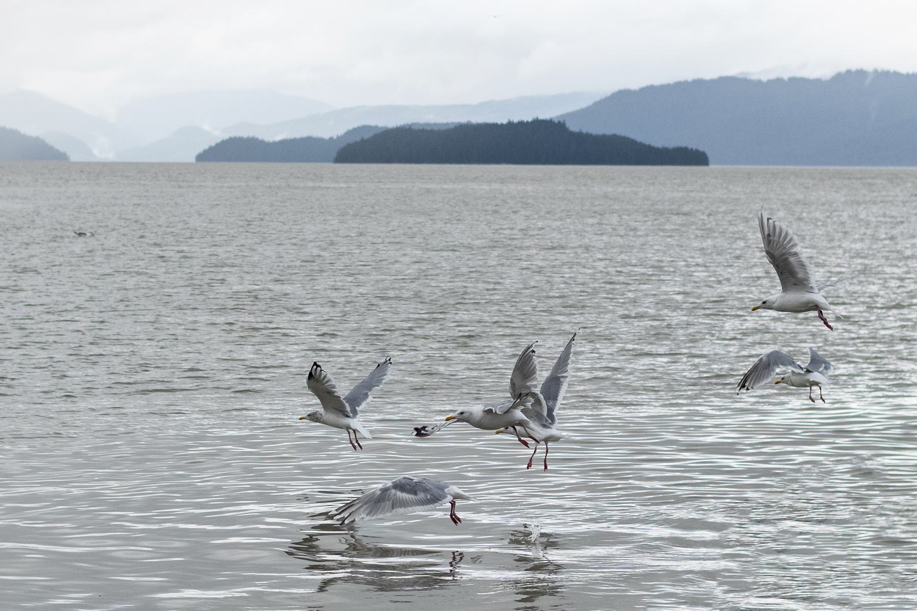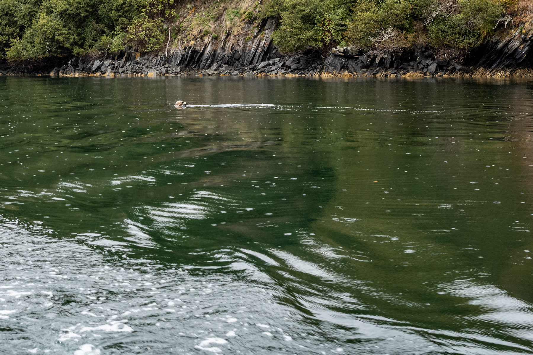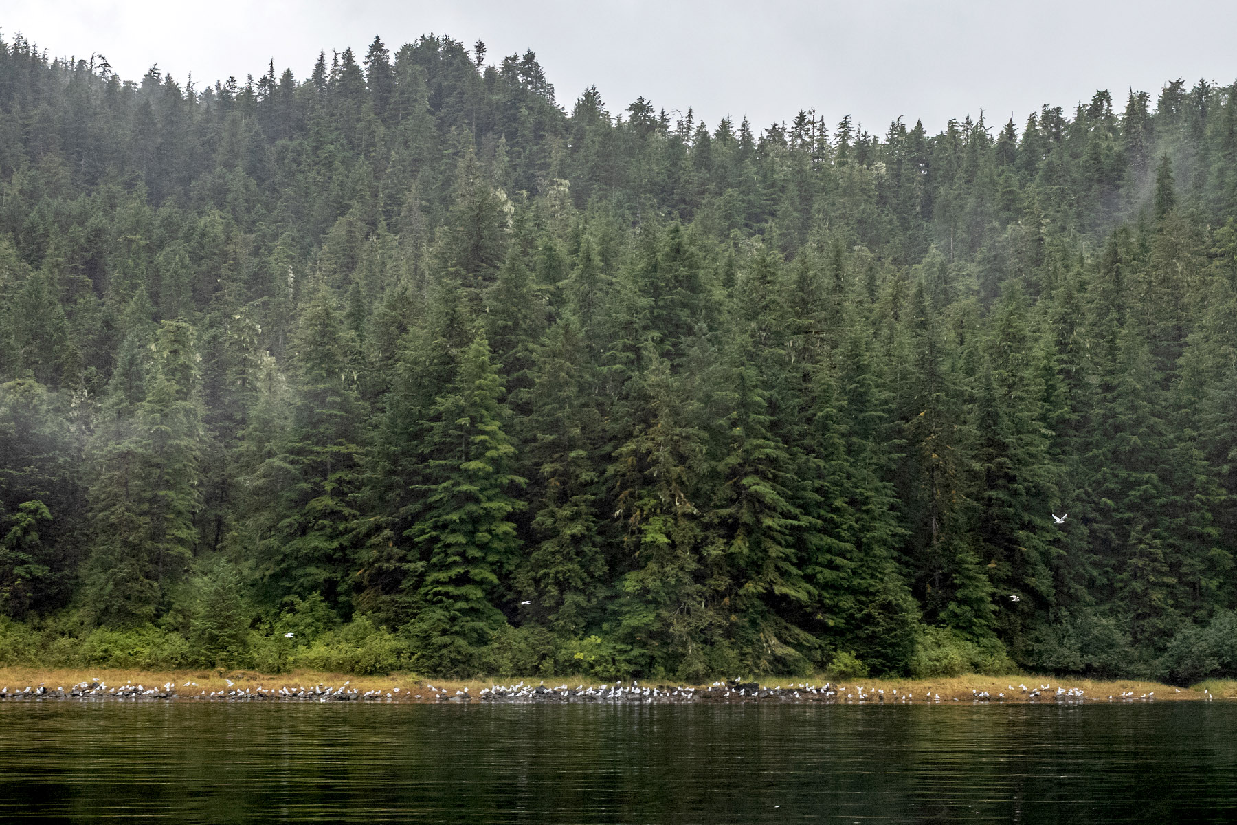 Wir sind in der Nacht durch die Uyak Bay in einen riesigen Fjord auf Kodiak Island eingefahren bis zum Nordspitzel von Amook Island, eine riesige langgezogene Insel im Fjord. Kodiak Island ist die zweitgrößte Insel der USA, was man ihr auf der Karte gar nicht ansieht. Das angekündigte trübe Regenwetter ist eingetroffen. Die Gegend ist interessant, weil hier schon richtige Wälder sind. Aber leider schaut alles grau in grau aus. Auf Kodiak Island wurden uns nicht garantierte Sichtungen der sogenannten Kodiak-Bären versprochen. Diese Kodiak-Bären sind die größten Braunbären wegen eines Gendefektes. Und es soll auf der Insel sehr viele geben. Wie gesagt: die versprochene Sichtung wurde nicht garantiert und das war leider wirklich garantiert. Der Guide/Zodiacfahrer hat dann auch gemeint, dass das eine relativ schlechte Gegend für Bärensichtungen ist. Aber wir haben viele Robben gesehen, einige Adler, ein riesiges Adlernest (leider leer) und wieder viel Fluggetier. Die Uferlandschaft ist sehr interessant, aber eben uninteressant für Bären. In die Bucht, die wir befahren haben, mündet am Ende ein Fluß, den die Lachse bergauf schwimmen müssen. Alle schaffen das nicht, weil sie von der weiten „Reise“ schon geschwächt sind. Die sterben dann an Erschöpfung und treiben im Wasser herum, bei Flut werden sie ans Ufer gespült. Schaut nicht sehr attraktiv aus. Ich dachte erst, dass die Lachse eigentlich arme Hunde sind, plagen sich ab mit der Heimreise, manche kommen durch, viele werden von Bären gefressen oder sterben an Erschöpfung. Und trotzdem bleiben noch genug Lachse für unser Nachtmahl übrig. Wenn sie also einen anderen Lebenslauf hätten, gäbe es zu viele Lachse. Es war heute ein ruhiger Tag, der Ausflug war trotz Regen recht gelungen. Man merkt nun, dass die Heimreise nicht mehr so weit ist, weil wir heute Formulare für die Einreise nach Kanada bekommen haben. Als Schiffsreisende brauchten wir keine EtA-Anmeldung, aber man muss ein kleines Formular ausfüllen. An der Schiffsrezeption haben sie ja auch unsere Pässe, das heißt, sobald wir in Vancouver ankommen, wird die Einreiseprozedur sicher im Paket für alle Passagiere erledigt. Morgen ist Ruhetag. Wir werden den Golf von Alaska überqueren in Richtung der Gletscher in der Icy Bay. Für die Nacht wurde windiges Wetter angekündigt mit ein wenig Wellengang.