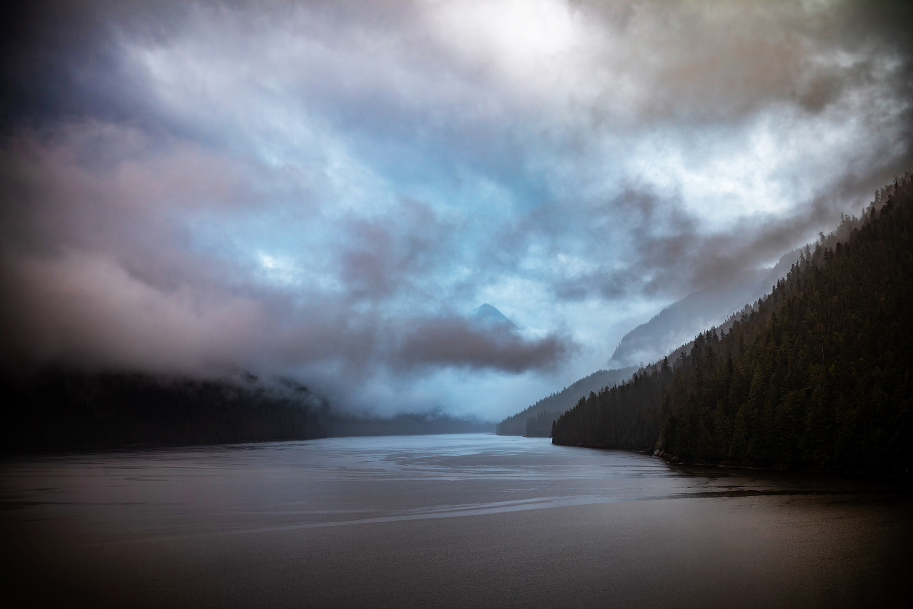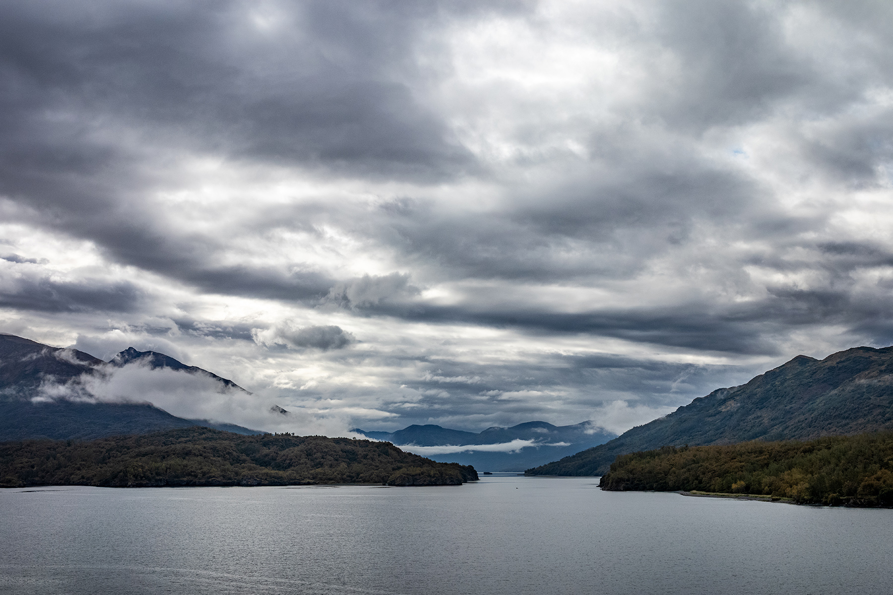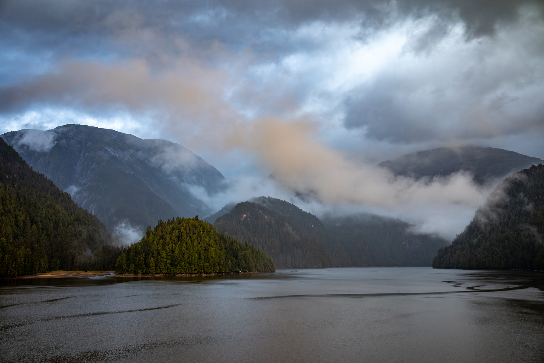 Und nun sind wir in der Inside-Passage zwischen British Columbia und Victoria-Island. Aber wir sehen nix. Hier sitzt der Nebel drinnen. Sehr sehr schade, weil das ist wirklich eine wunderschöne Fjordgegend. Noch dazu fahren wir relativ langsam durch. Vielleicht hebt sich der Nebel noch.