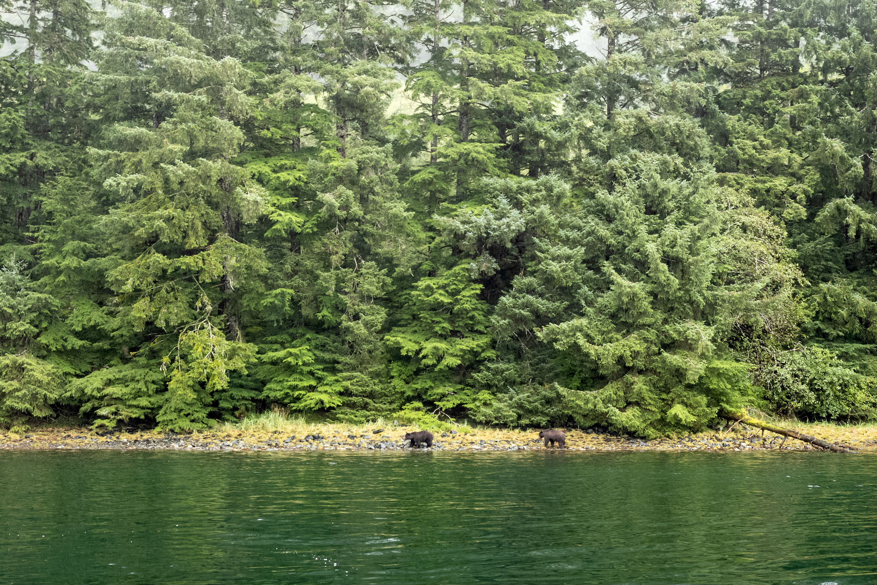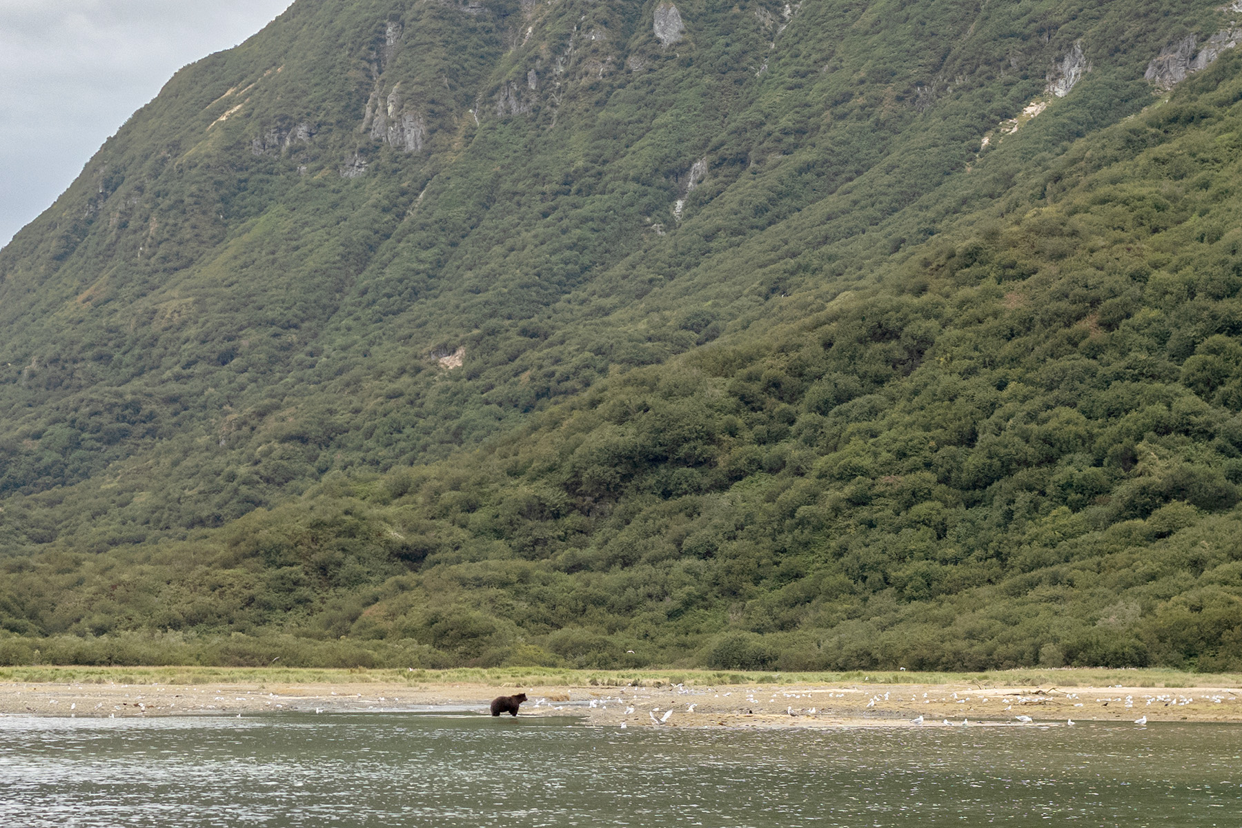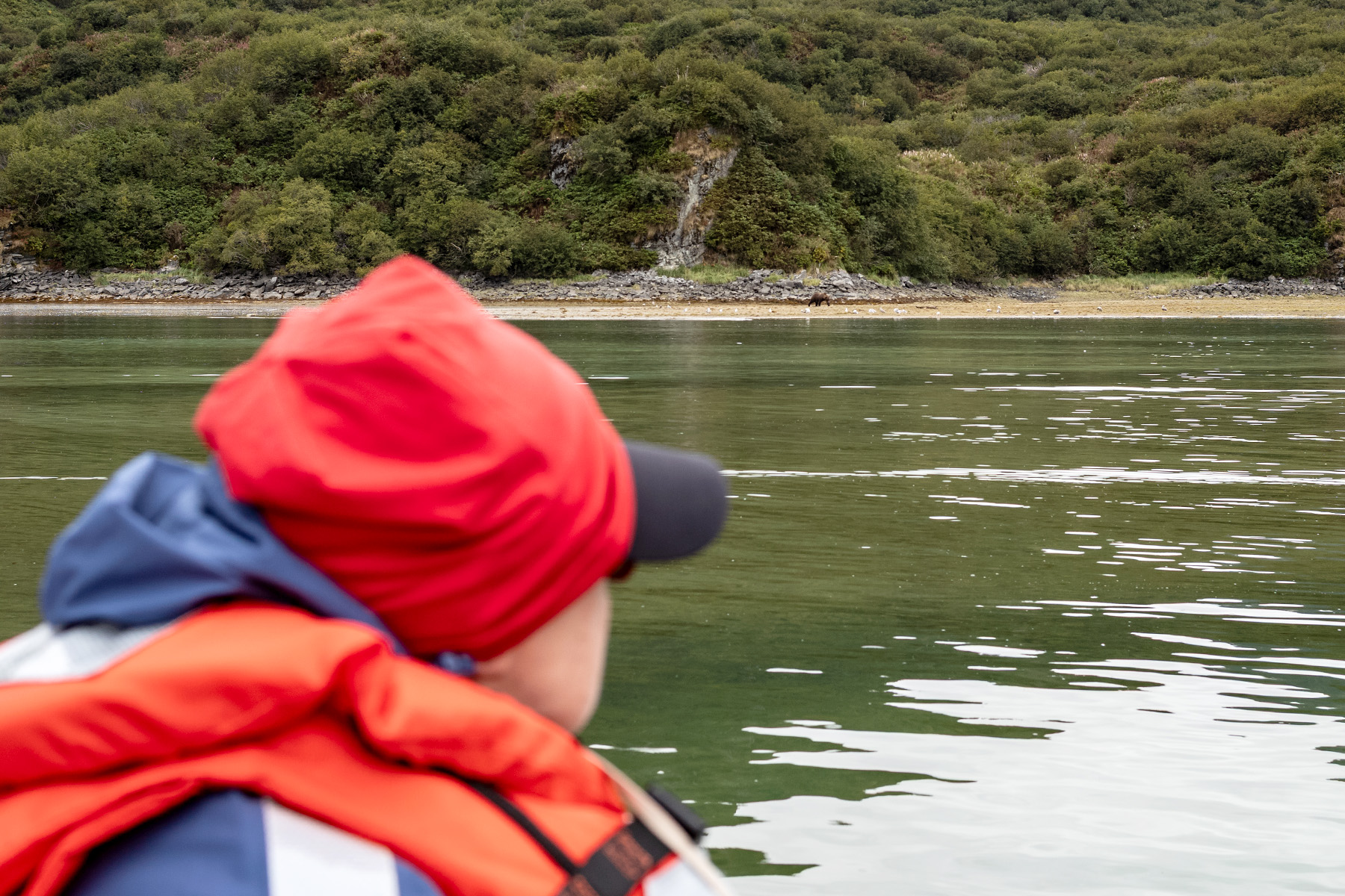 Mittlerweile ist der Nachmittagsausflug vorbei. Heute wurden wir nur mit den Zodiacs herumgefahren, weil wir in einem Schutzgebiet sind und in dieser Gegend viele Bären zu Hause sind. Und hier gibt es Wald bzw. dichtes Buschwerk. Diese Buchten, fast wie Fjorde, sind für Anlandungen und Spaziergänge nicht geeignet. Die Bären haben wir gesehen. Insgesamt 5 Stück Braunbären. 2 waren etwas weiter weg aber 3 sind am Strand entlang spaziert, wir waren ungefähr 150 m entfernt. Irgendwie waren wir ihnen egal, obwohl stundenlang immer an die 4-5 Zodiacs anwesend waren. Weiter in die Nähe dürfen die Zodiacs nicht fahren, weil wir ja die Tierwelt und die Natur nicht stören sollen. Die Bären halten sich hier auf, weil sie Muscheln und Seegras fressen und, wenn sie vorbeikommen, Lachse. In ein paar Wochen ziehen sie sich dann in den Winterschlaf zurück.