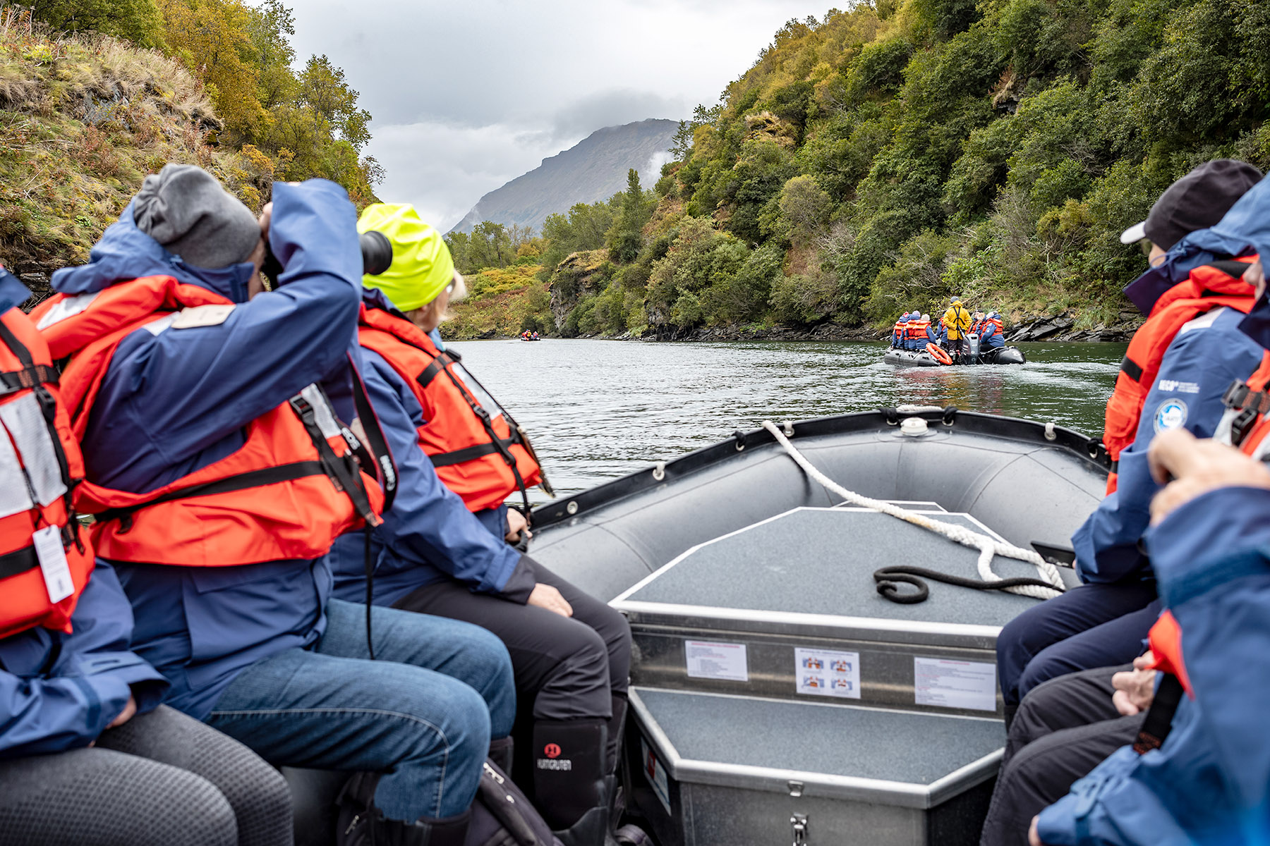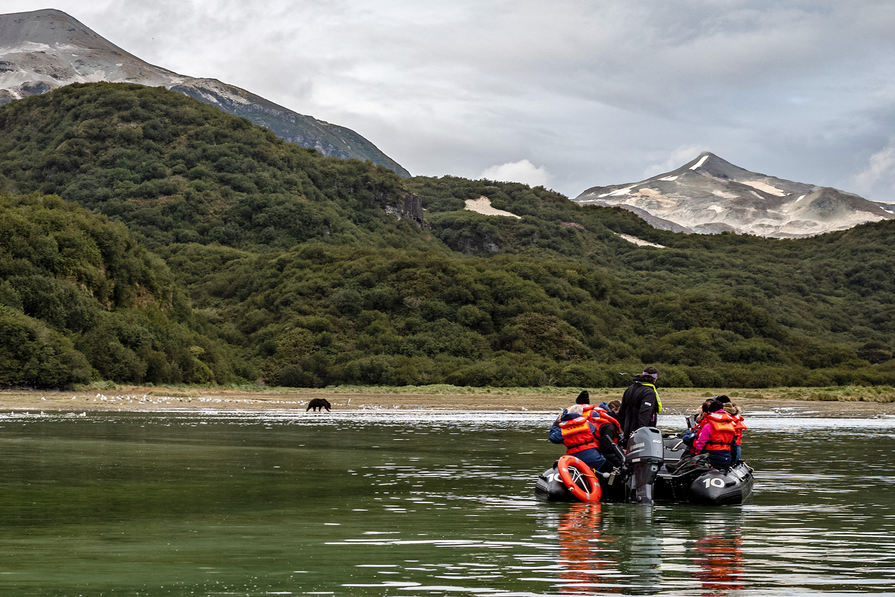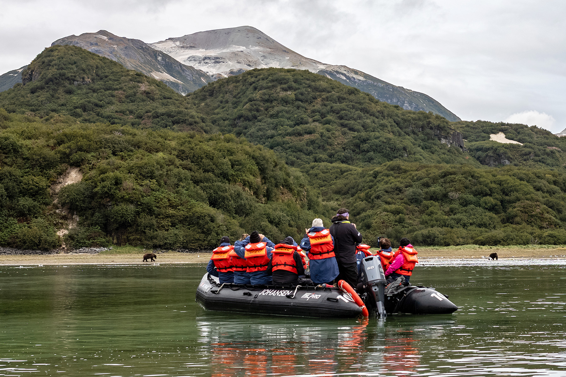 Mittlerweile ist der Nachmittagsausflug vorbei. Heute wurden wir nur mit den Zodiacs herumgefahren, weil wir in einem Schutzgebiet sind und in dieser Gegend viele Bären zu Hause sind. Und hier gibt es Wald bzw. dichtes Buschwerk. Diese Buchten, fast wie Fjorde, sind für Anlandungen und Spaziergänge nicht geeignet. Die Bären haben wir gesehen. Insgesamt 5 Stück Braunbären. 2 waren etwas weiter weg aber 3 sind am Strand entlang spaziert, wir waren ungefähr 150 m entfernt. Irgendwie waren wir ihnen egal, obwohl stundenlang immer an die 4-5 Zodiacs anwesend waren. Weiter in die Nähe dürfen die Zodiacs nicht fahren, weil wir ja die Tierwelt und die Natur nicht stören sollen. Die Bären halten sich hier auf, weil sie Muscheln und Seegras fressen und, wenn sie vorbeikommen, Lachse. In ein paar Wochen ziehen sie sich dann in den Winterschlaf zurück.