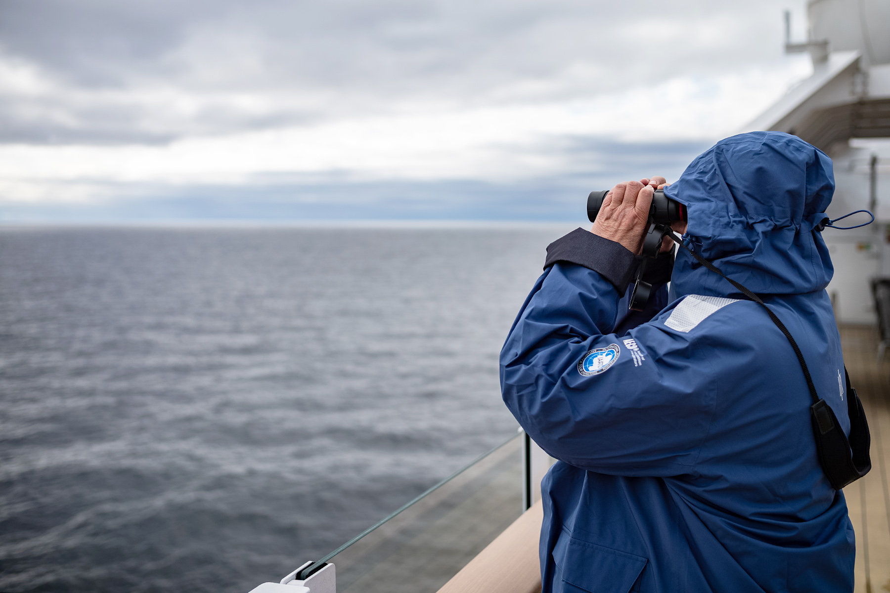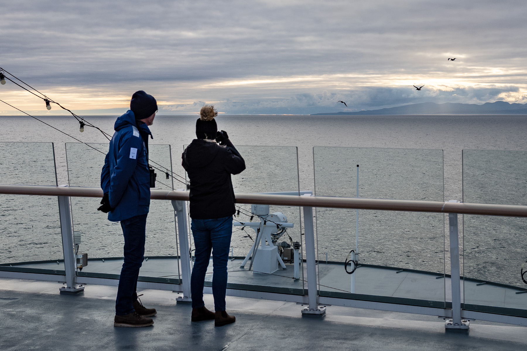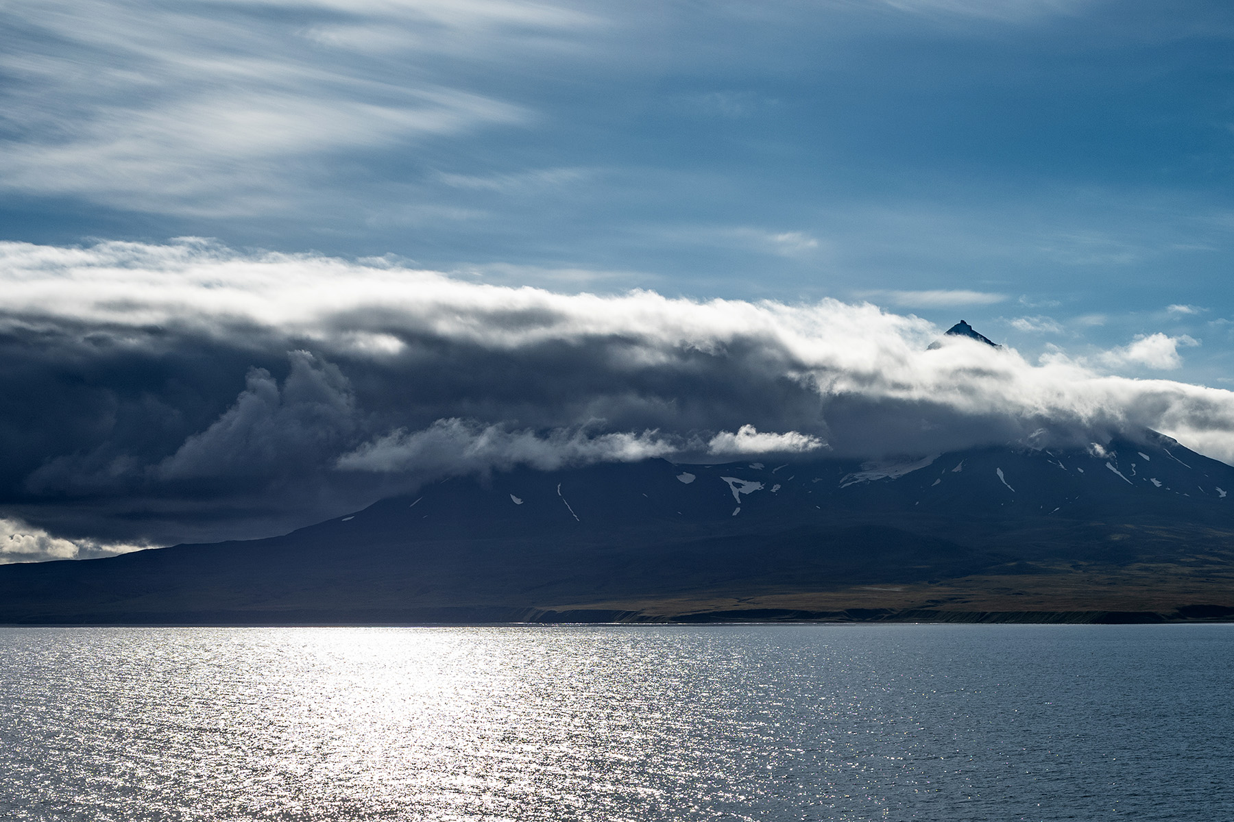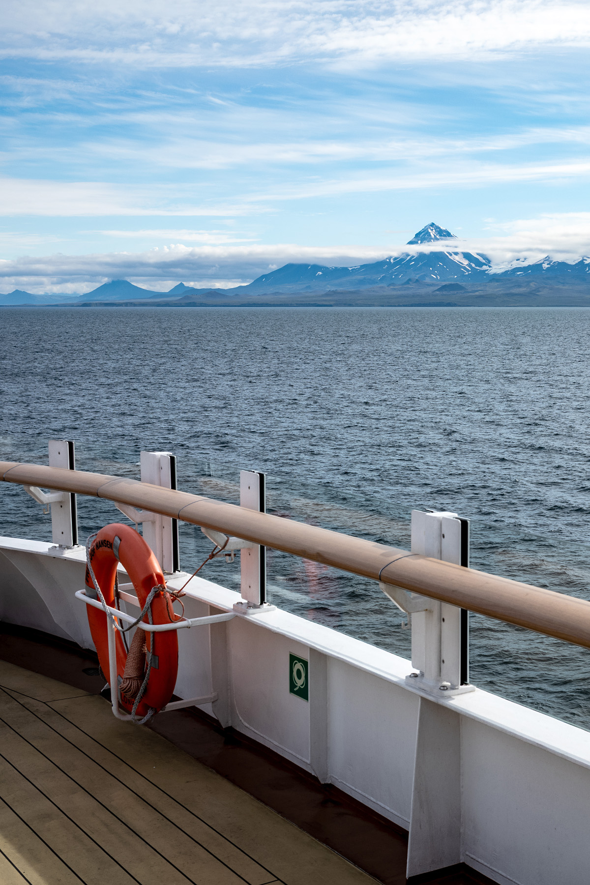 Es ist jetzt 10:15 und wir cruisen an St.Lawrence Island vorbei. Die See ist wackelig, aber nicht heftig. Zwischen den Wolken blitzt es blau durch. Wir haben auch schon viel erledigt: Frühstück, 5 Minuten am Aussendeck, Expeditionsjacken abgeholt, Erklärungen am Ausflugsschalter eingeholt. Mit den Jacken wurde festgelegt, dass wir Wale sind. Das bedeutet, dass wir bei den Ausflügen dran sind, wenn die Gruppe „Wale“ aufgerufen wird. Bei unseren früheren Reisen mit Hurtig waren wir bloß Nummern.