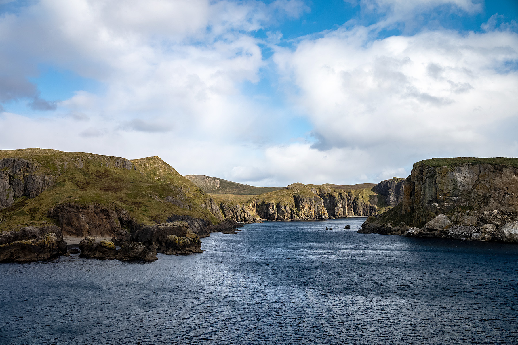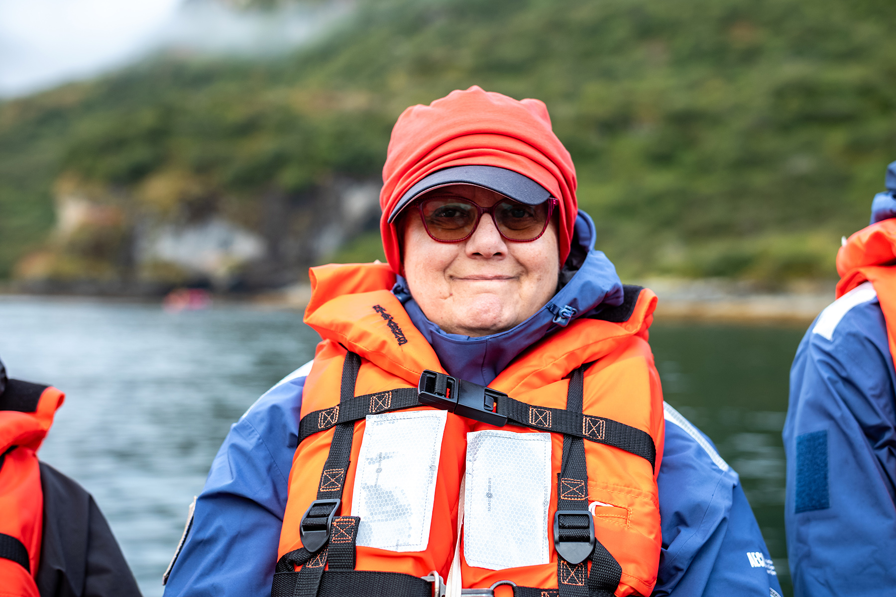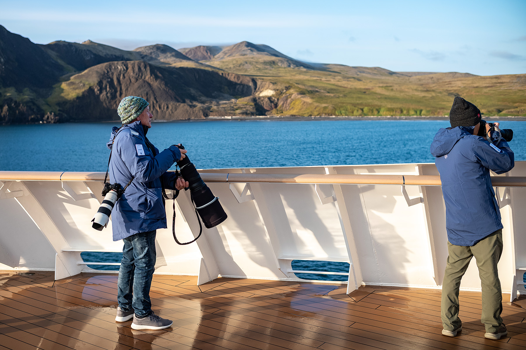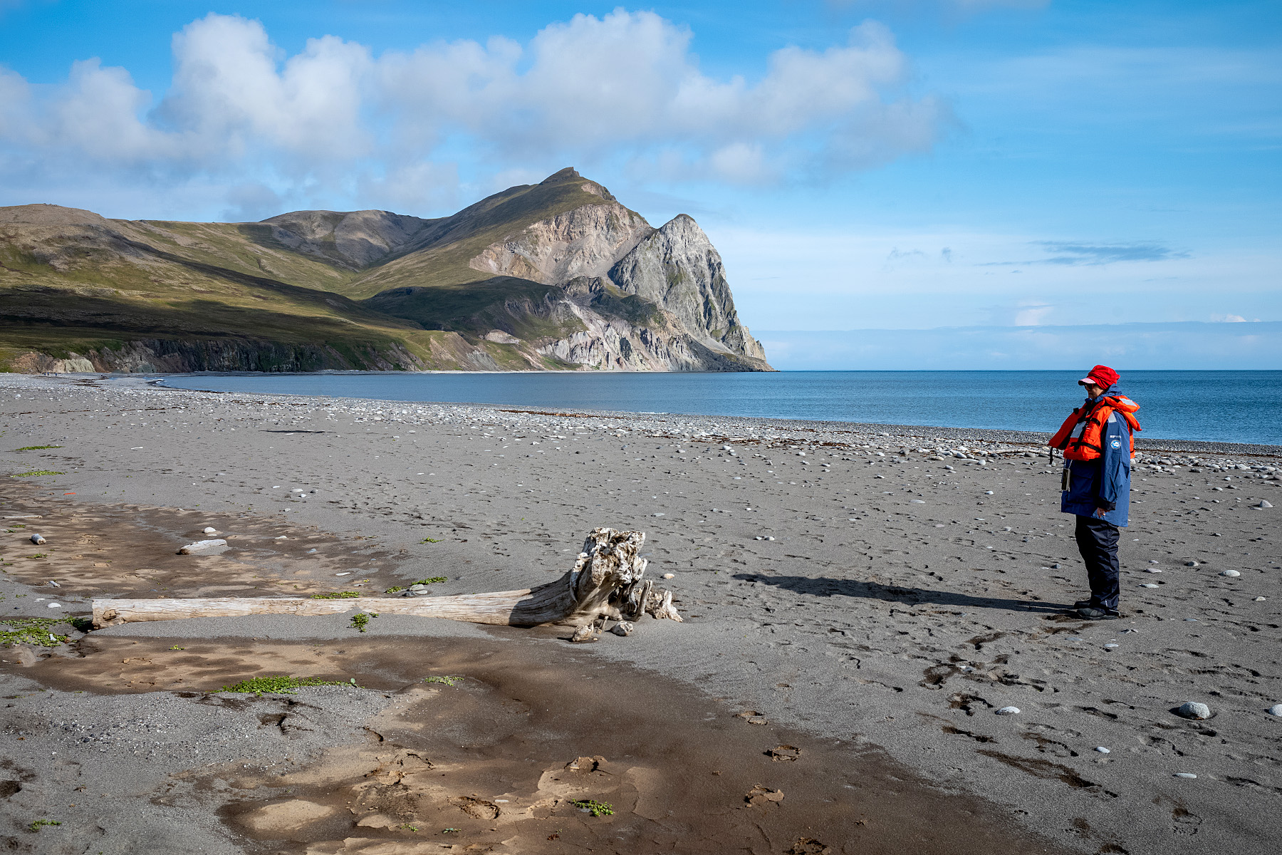 Es ist jetzt 10:15 und wir cruisen an St.Lawrence Island vorbei. Die See ist wackelig, aber nicht heftig. Zwischen den Wolken blitzt es blau durch. Wir haben auch schon viel erledigt: Frühstück, 5 Minuten am Aussendeck, Expeditionsjacken abgeholt, Erklärungen am Ausflugsschalter eingeholt. Mit den Jacken wurde festgelegt, dass wir Wale sind. Das bedeutet, dass wir bei den Ausflügen dran sind, wenn die Gruppe „Wale“ aufgerufen wird. Bei unseren früheren Reisen mit Hurtig waren wir bloß Nummern.