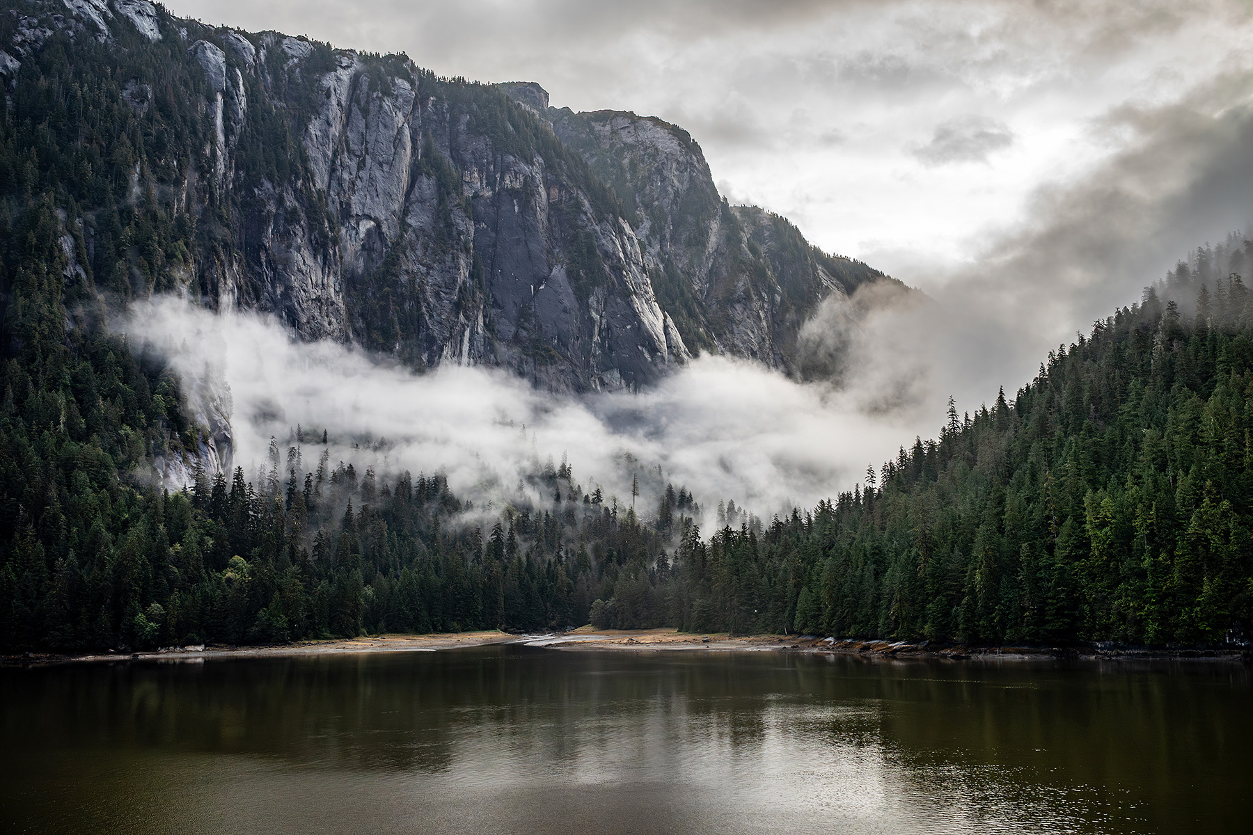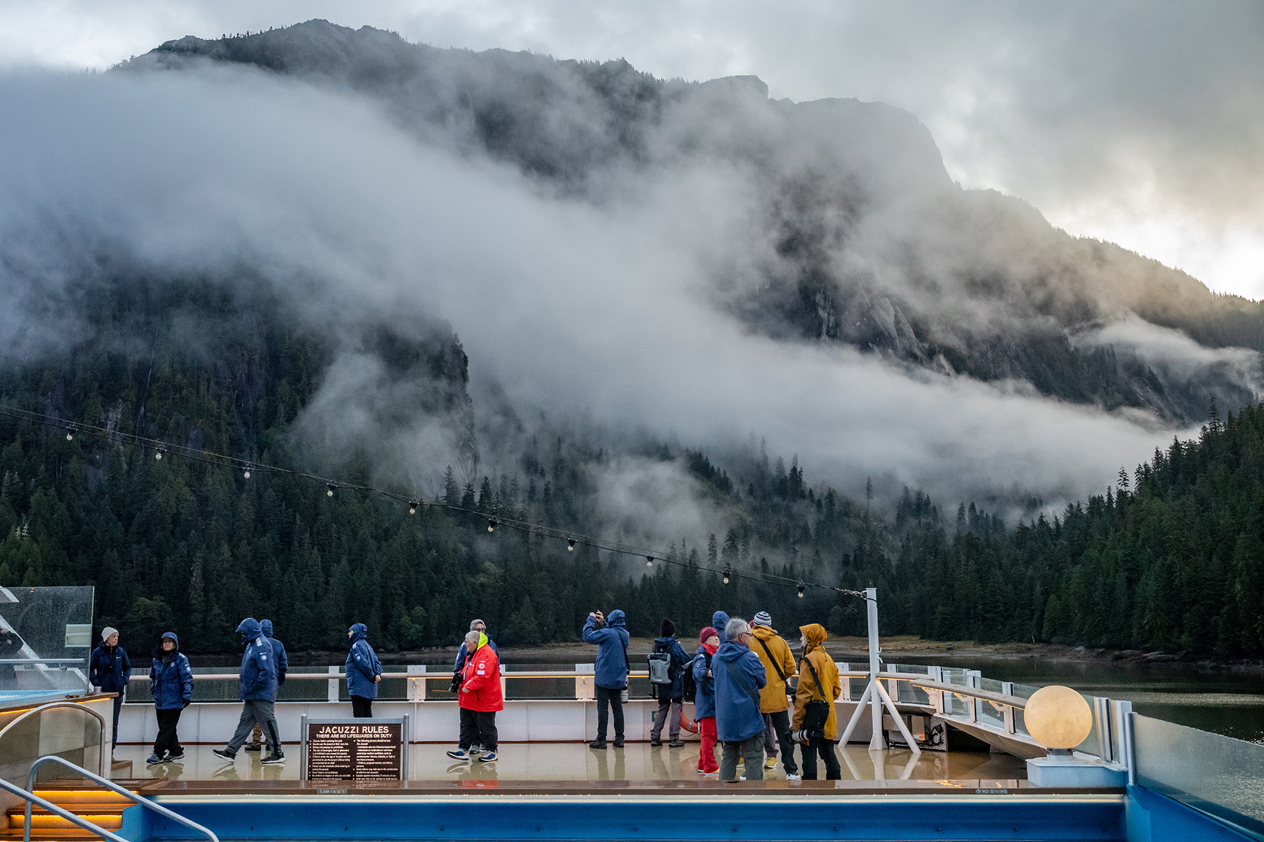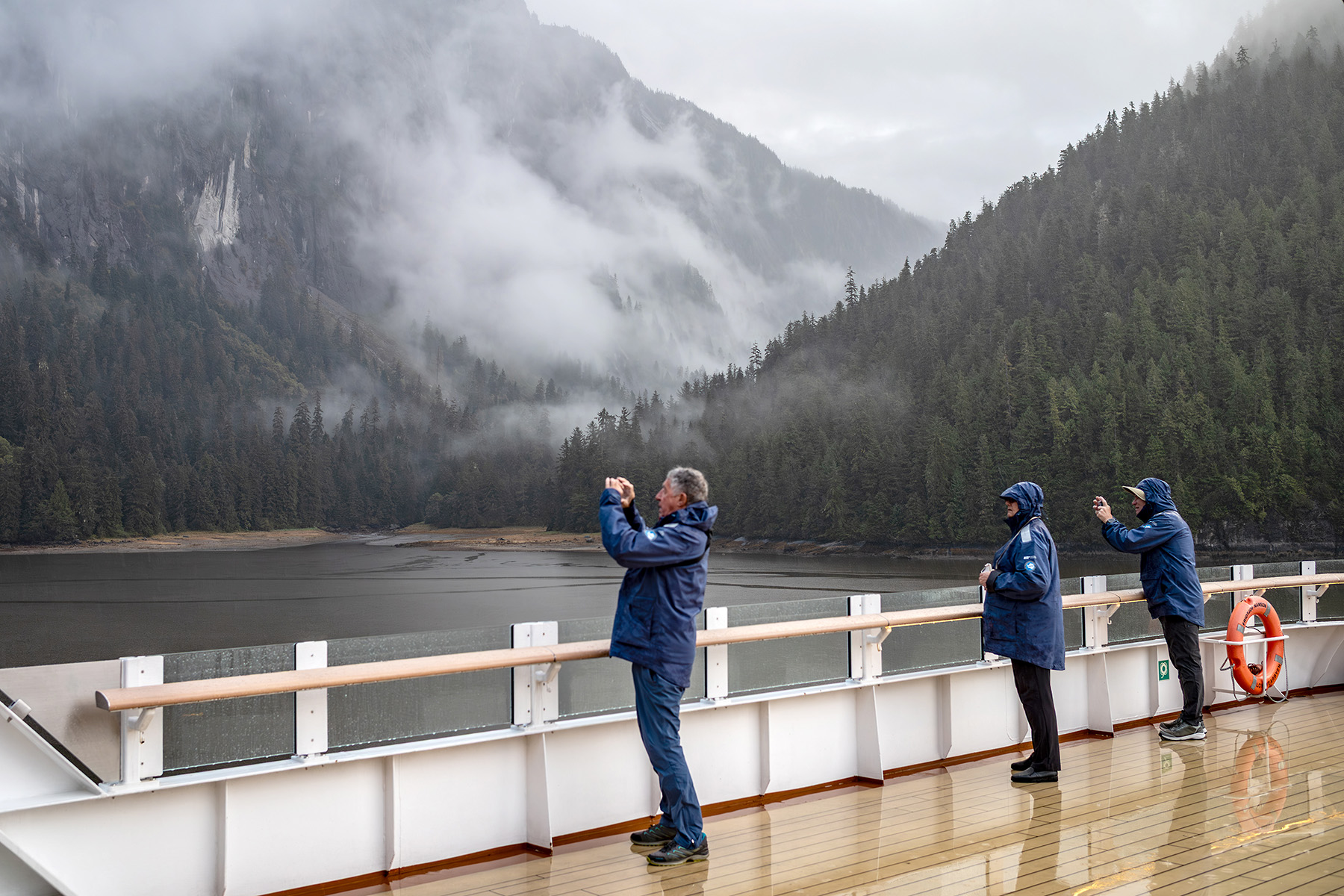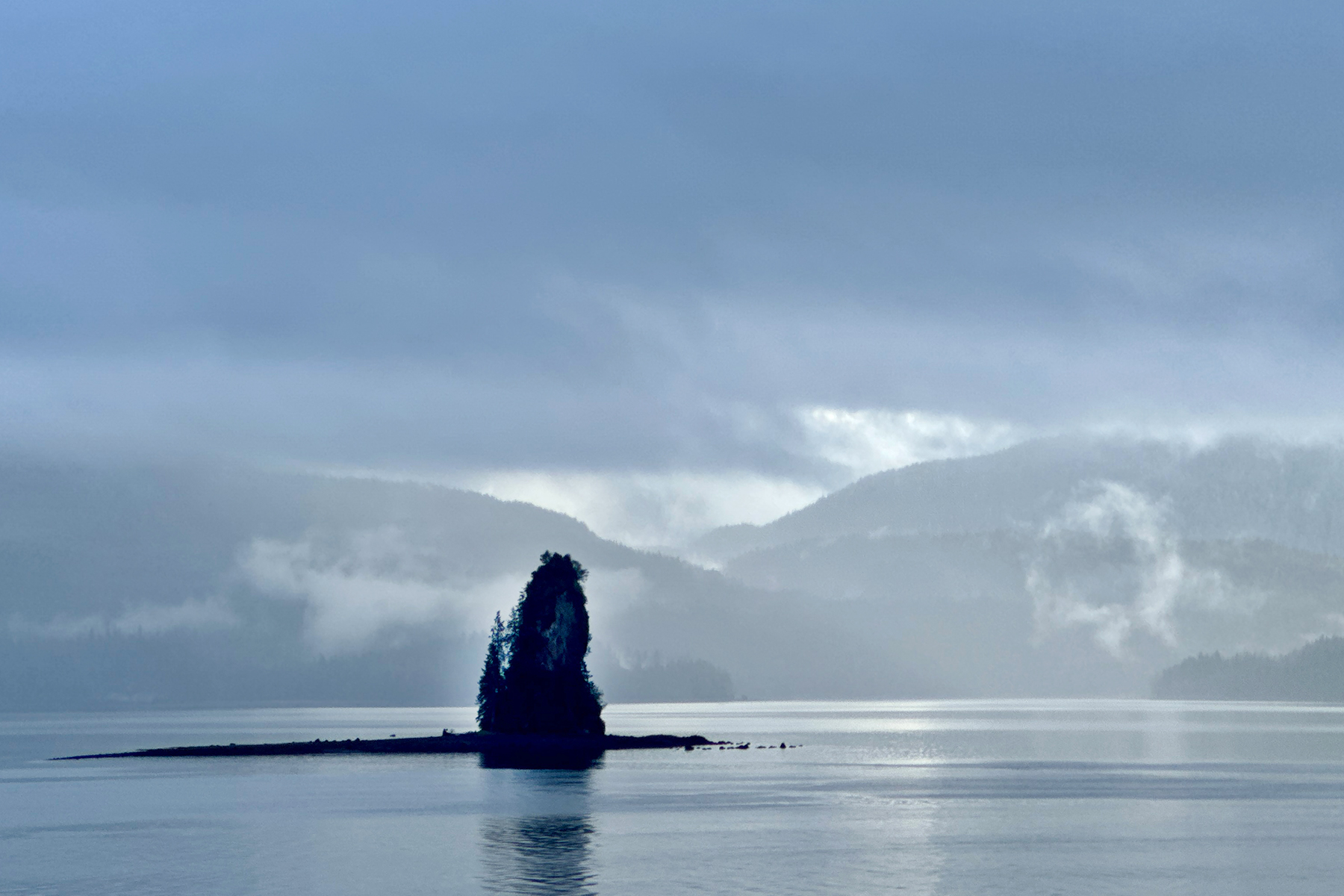 Heute und morgen sind reine Seetage. Da wir aber nahe der Fjordküste sind und teilweise in die Fjorde einfahren und weil auch der Wind nicht mehr ganz so stürmisch ist, haben wir relativ ruhiges Fahrwasser. Also keine „motion in the ocean“. Ungefähr um 6:00 in der Früh sind wir in den Misty Fjord eingefahren. Es war wie der Name verspricht. Noch finster, nebelig und verregnet. Das wurde uns natürlich gestern Abend bei der Besprechung für den nächsten Tag als äußerst positiv angekündigt. Misty Fjord bei Schönwetter macht ja gar keinen Sinn. Das gesamte Personal hier, vom Kapitän bis zum Maschinenschlosser, muss eine extra Ausbildung erhalten haben in: wie rede ich mir und den Passagieren alles schön. So gegen 07:00, zum Sonnenaufgang haben vereinzelt blaue Stellen durch die Wolken-Nebeldecke geblitzt. Aber nicht lange. Im Endeffekt waren wir patschnass nur vom Schauen wie nach der Zodiacfahrt im Regen in der Icy Bay. Aber trotz allem: die Gegend hat was. Total still, rundherum alles mit Regenwald bedeckt und dazwischen die Bären (die wir natürlich nicht gesehen haben). Bevor man aus dem Misty Fjord wieder ins offene Meer gelangt, fährt man am Eddystone Rock vorbei. Das ist ein Überbleibsel von einem Vulkanausbruch und heißt so, weil der Fels den Entdecker an den Eddystone-Leuchtturm vor der Küste vor Cornwall erinnert hat. So kommt man halt auch zu einem Namen.