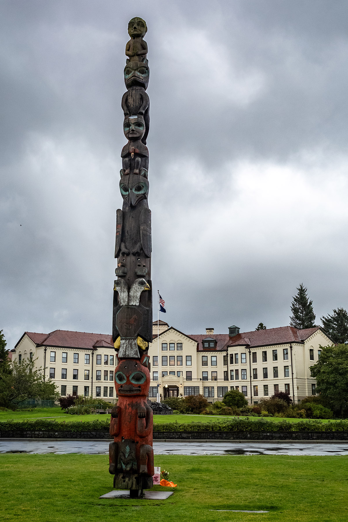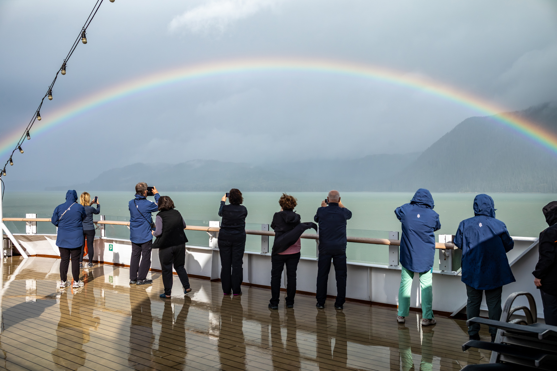 Diese Nacht war wie angekündigt sehr heftig. Es ist in der Kabine nix herumgeflogen, aber im Badezimmer gab es einige Verschiebungen im Regal und manchmal hatte man schon die Angst, aus dem Bett zu fallen. Aufgrund des starken Gegenwindes haben wir laut Kapitän Verspätung bei der Ankunft in Wrangell und weil die Küstenwache ihn gebeten hat, bei einer Rettungsaktion mitzumachen werden wir insgesamt 2,5 Stunden später ankommen. Das haut natürlich alle Pläne durcheinander, denn ab 10:15 sollten bereits die Landgänge starten und nun werden wir erst um 12:30 ankommen. Wir werden sehen, was dann noch zu machen ist. Übrigens waren wir bei der Rettungsaktion schlussendlich nicht notwendig, weil die Küstenwache den schiffbrüchigen Fischer eh schon gefunden hatte. Das Highlight am Vormittag – abgesehen von einem gewaltigen Regenguss, der wie eine graue Wand über uns drüber gezogen ist – war der darauffolgende riesige Regenbogen. Die Landgänge haben dann um 13:00 begonnen. Einige Wanderungen wurden zusammengelegt, weil Leute aufgrund der Warnungen storniert haben. Wegen dem vielen Starkregen und heftigem Wind sind die Wege natürlich sehr unsicher zu begehen. Die Tenderboot-Zeiten sind natürlich auch in Durcheinander geraten. Aber schlussendlich waren alle Passagiere an Land und haben Spaziergänge machen können. Die Stadt ist halt auch wieder eine, wo man eher nicht leben möchte. Obwohl sie eh auch alles haben. Vor allem viele Baumärkte und Läden mit Schiffszubehör. Wahrscheinlich muss man in solch einer Gegend Bastler mit Bootschein sein. Aber im Vergleich zu Nome, unserer ersten Ortschaft in Alaska, ist Wrangell ein bezauberndes Städtchen. Nome ist halt schon ganz weit im Norden, da will wohl kaum noch wer leben. Zurück zu Wrangell: wir waren auch in einem Supermarkt weil wir ein paar Chips brauchten. Es gibt natürlich alles. ½ kg Äpfel kostet 2,49$ + Tax, da bekommt man bei uns schon 1 kg. Dafür kostet ein großes Steak (Gewicht war nicht feststellbar, aber sehr groß) 4,49$ + Tax. Gute Wurst gibt’s sowieso nur in Österreich, Käse ebenfalls. Da schauen die Regale arm aus. Die Werther-Zuckerl kosten hier ebenfalls weniger. Milch ist natürlich total biologisch und die Kühe hatten auf keinen Fall genmanipuliertes Futter. Die Farm ist familiengeführt (steht alles auf der Packung). Warum das die Milch aufwerten soll, weiß ich nicht, weil auch ein Betrieb mit tausend Kühen gehört im Endeffekt einer Familie, entspricht aber doch eher einer Fabrik. Aber gut, das ist ja bei uns auch nicht anders. Wrangell hat, wie alle Ortschaften, ein Museum. Ich finde das nicht so schlecht, weil jeder Ort hat eine Geschichte, warum die nicht ausstellen? Es gibt ortsansässige Künstler, es gibt die Geschichte der früheren Bewohner. Es gibt ausgestopfte Tiere der Umgebung, alles Mögliche. Und einen Shop. Das Wetter hat halbwegs gepasst. Nach der extremen Regenfront hat bei Ankunft in Wrangell die Sonne gescheint, bald darauf ein bisschen Regen, dann wieder aufgelockert, wieder Regen. Immer im Wechsel, aber im Großen und Ganzen sind wir gut durchgekommen. Einmal keine Regenhose. Es war ein guter Tag und der letzte Landgang bis Vancouver. Dafür wird die Landschaft sehr schön werden. Zu erwähnen wäre noch die Nr. 6 der Studienobjekte. Ein deutscher Schreinermeister, alleinreisend. Der hat sich schon am ersten Tag mit dem Franz „angefreundet“ und ihm allerhand erzählt. Er plaudert gerne und viel, aber man versteht ihn überhaupt nicht. Er kommt sicher nicht aus Bayern, den Dialekt kennt und versteht man. Es hört sich auch nicht nach hohem Norden an, vielleicht schwäbisch. Jedenfalls erzählt er uns immer so viel, wir lachen und nicken und haben keine Ahnung wovon er redet.