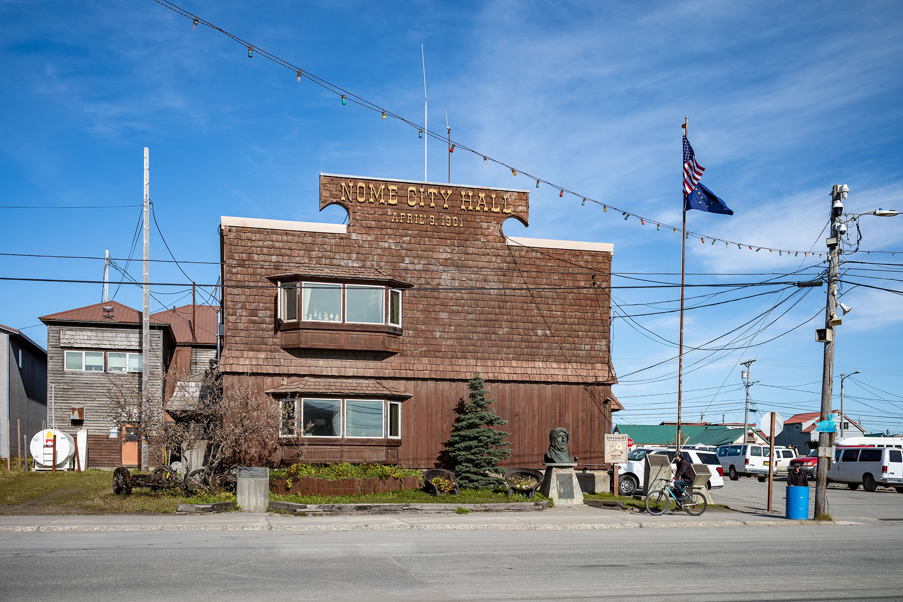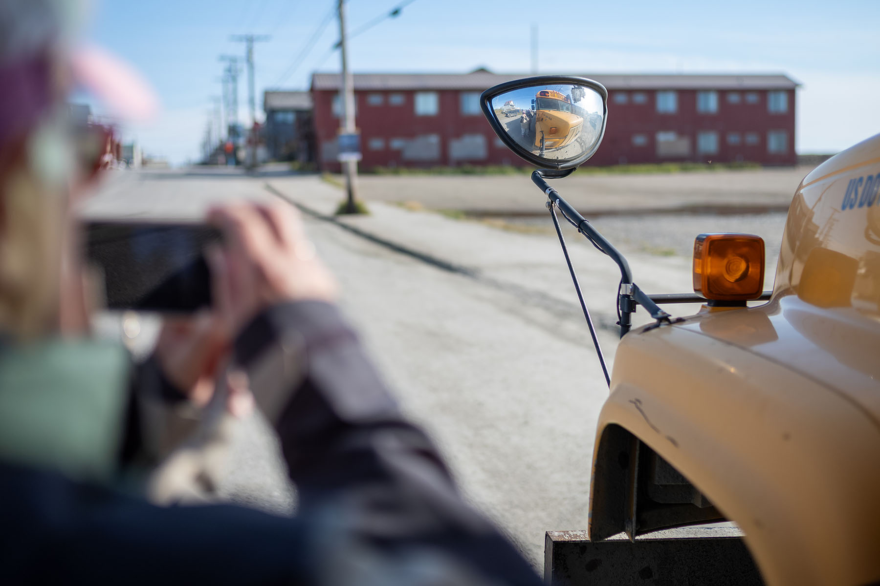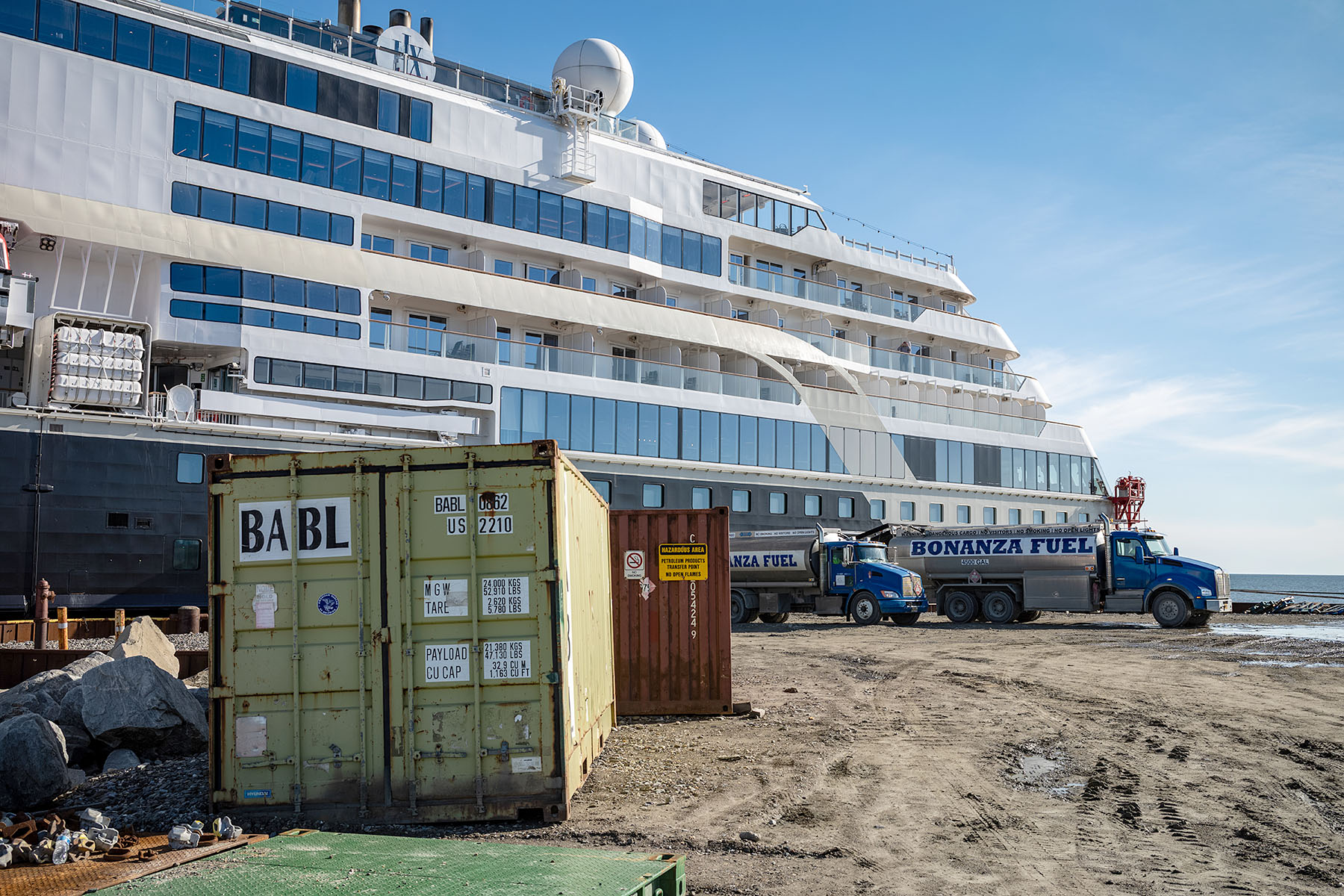 Mittlerweile ist es 20:45, wir fahren und schwanken ein bißl, haben zu Abend gegessen und uns in der Kabine häuslich eingerichtet. Vom Flughafen wurden wir in alten Schulbussen zum Schiff gebracht, die Koffer separat später, dafür direkt zur Kabine. Das Einchecken war im Nu erledigt und die Pässe sind einbehalten worden. Die Kabine ist groß und gemütlich, mit großem Fenster. Es hätte noch Kabinen mit Balkon gegeben, sogar welche mit eigenem Whirlpool, aber das ist nicht wirklich notwendig. Da bis zur Abfahrt noch Zeit war, sind wir mit einem Shuttlebus in die Ortschaft gefahren. Da muss ich jetzt doch sagen, dass ich hier nicht wohnen wollen würde. Auch der Hafen ist nicht einladend. Die schöne Fridtjof Nansen ankert in einer Baustelle. Nächstes Jahr soll der Hafen angeblich ein Schmuckstück sein. Wir werden es nicht sehen. Zurück zu Nome: die Einheimischen, also die Nativepeople sind freundlich, grüßen und heißen einen willkommen. Manche wollen irgendwelche Andenken verkaufen. Die Häuser sind aus Holz, obwohl es weit und breit keinen Wald gibt. Nur Treibholz am Strand, das vermutlich von Russland über das Meer her getrieben wird. Alles wirkt heruntergekommen und arm. Aber die Autos sind groß. Der Tag war wieder sehr lang. Morgen ist Seetag, wir können ausschlafen. Programmpunkte sind nur: Expeditionsjacken ausfassen und Gummistiefel probieren. Gute Nacht.