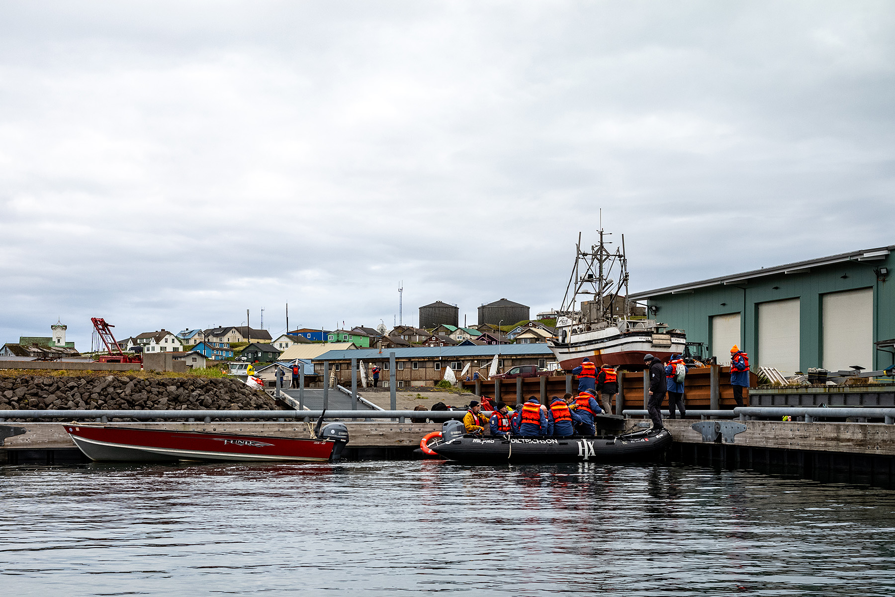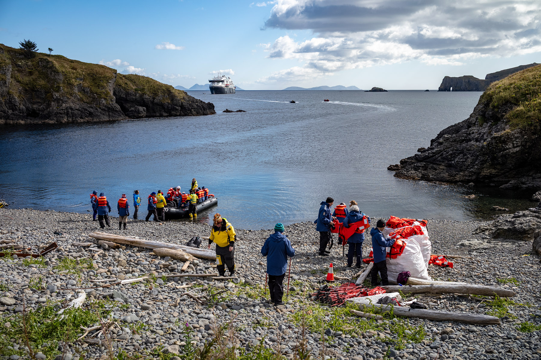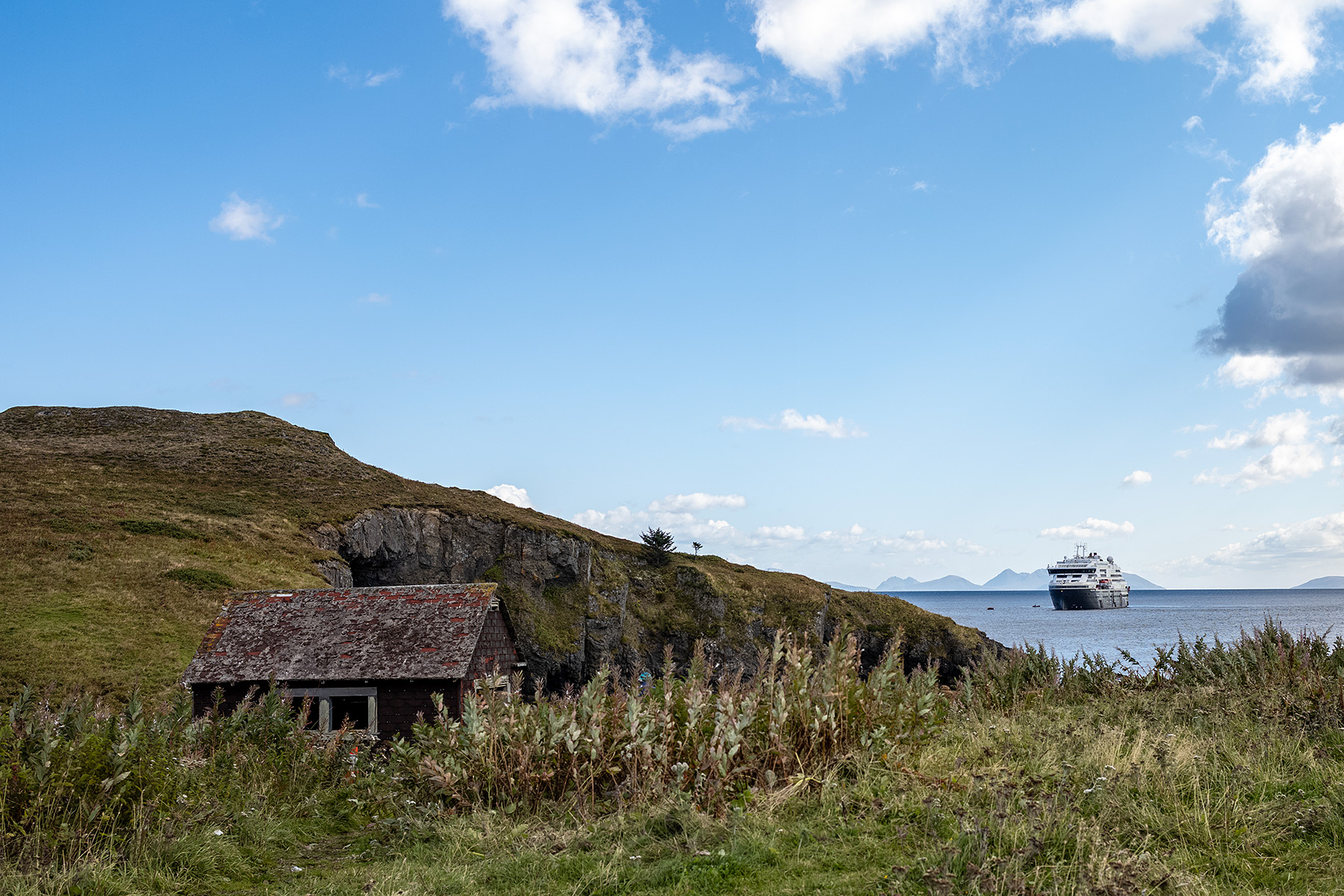Bevor es mit dem Ausflug los geht, ist es wieder Zeit für ein paar Worte zum Schiff. Es ist sehr schön, noch ziemlich neu. Hat Platz für gesamt 530 Passagiere, wir sind aber laut Information vom Kapitän nur 313. Was sehr angenehm ist. In den Restaurants ist Platz genug, ebenso in der sogenannten Explorer Lounge auf Deck 10. Dort sind rundherum Fenster, genügend Sitzplätze verschiedenster Art. Und die Bar. Die meisten Leute lesen hier und schlafen dabei ein. Einige Frauen haben ihr Strickzeug dabei. Es ist rundum gemütlich. Außendecks gibt es ebenfalls zur Genüge. Wir haben eine „normale“ Kabine, die ist ca. 23 m2 groß. Eingerichtet ist die Kabine äußerst praktisch, mit viel Ablageplatz, Schrank, Laden, Schreibtisch. Ganz super ist das Badezimmer. Obwohl recht klein ist es sehr praktisch eingerichtet. Mit mehr Ablageflächen und Haken als in so manchem Badezimmer in einem 5-Sterne Hotel. Sogar die Dusche ist ausgesprochen groß für das kleine Bad. Und es gibt einige Haltegriffe. Das Essen ist auch nicht so übel. Keine Steirereck-Küche aber genießbar. Also merken: wer in eine kalte Gegend reisen will, sollte mit der Fridtjof Nansen fahren. Von den 311 Mitreisenden sind nun geschätzt 178 verkühlt und husten und schnupfen. Einige Tage müssen wir noch durchhalten😊. Den Pool haben wir noch nicht ausprobiert. Der Weg von 10 Metern von der Umkleide bis zum warmen Wasser ist einfach zu weit. Besonders der Retourweg. Irgendwann am Anfang der Reise habe ich gemeint, dass 2 Österreicher auf dem Schiff sind. Wir sind mehr. An die 10 Leute. Das Handhygienekonzept ist ein wenig eigenartig. Früher gab es vor dem Restaurant Desinfektionsspender, die die Leute relativ brav verwendet haben. Jetzt sind solche Spender zwar noch immer am ganzen Schiff verstreut montiert, werden selten verwendet, weil vor dem Restaurant gilt nun kontrollierte Händewaschpflicht. Auch wenn man vorher desinfiziert hat, muss man waschen. Und diese Wascherei wird recht rasch erledigt und das Wasser ist kalt. Wäre nicht das Desinfizieren gscheiter? Naja, irgendein Gesundheitsökonom wird das wahrscheinlich so bestimmt haben. Den Ausflug haben wir nun erledigt. Anlandung auf Unga Island in einer Bucht, wo die Überreste der Siedlung Unga Village zu finden sind. Die Insel wurde Ende des 18.Jahrhunderts entdeckt und dann von den Aleuten und russisch vermischten Menschen besiedelt. Bis 1958 gab es sogar ein Postamt. Die letzte Familie hat die Insel 1969 verlassen. Die Menschen hatten auch Kühe, es gibt heute noch welche. Die Hinterlassenschaften dieser Kühe haben wir gesehen, die Tiere selber haben sich wahrscheinlich wegen der Besucherinvasion hinter ein paar Hügel verzogen. Die Häuser sind natürlich alles verfallene Holzhütten, die jederzeit zusammenbrechen können. Es liegt auch noch viel Werkzeug- und Maschinenschrott herum. Vor der Anlandung wurden wir mit dem Zodiac noch zu einigen Felsen gefahren mit viel Vogelbestand. Und da zeigte sich wieder, wie unpraktisch diese Schlauchboote sind. Man kann nicht aufstehen zum Fotografieren, es schaukelt wie wild und man muss sich gut festhalten. Mit den Beinen / Schuhen schlupft man auch unter ein Seil, das am Boden gespannt ist. Man fühlt sich ein bißl wie bei Greenpeace 😊. Die Zodiacs auf unseren früheren Reisen waren da sehr viel praktischer. Hatten Sitzbänke, dadurch hat man sich am Schlauchwulst angelehnt, in der Mitte war ein Geländer zum Anhalten, da durfte man auch aufstehen, wenn das Boot langsam gefahren ist. Und das Ein-und Aussteigen war über 2 Stufen mit Geländer am Bug. Warum sie diese Boote nicht mehr verwenden, verstehe ich nicht. Weil nun kann man während der Fahrt kaum noch fotografieren oder filmen. Das geht halbwegs, wenn man vorne am Bug sitzt. Aber es ist wie es ist und der Ausflug war trotzdem gut.