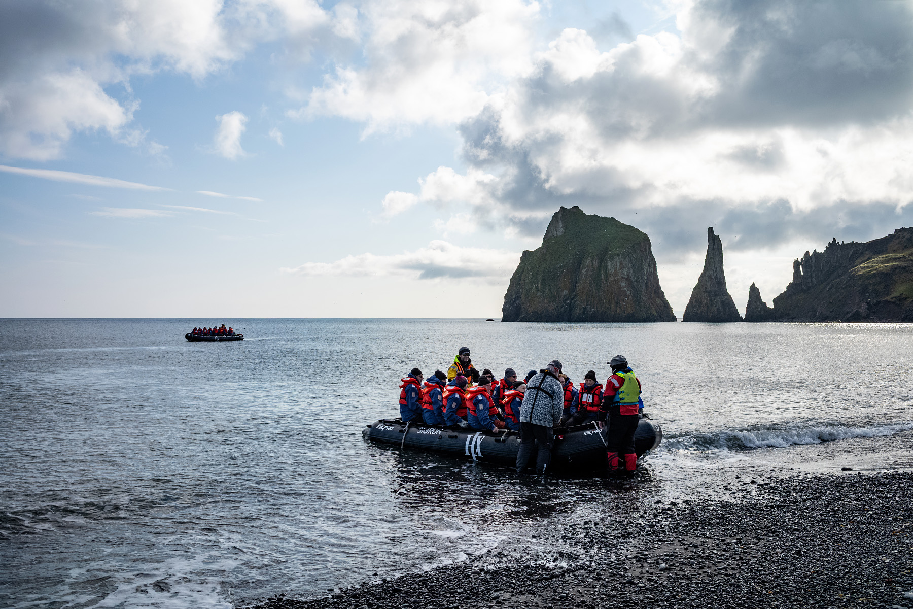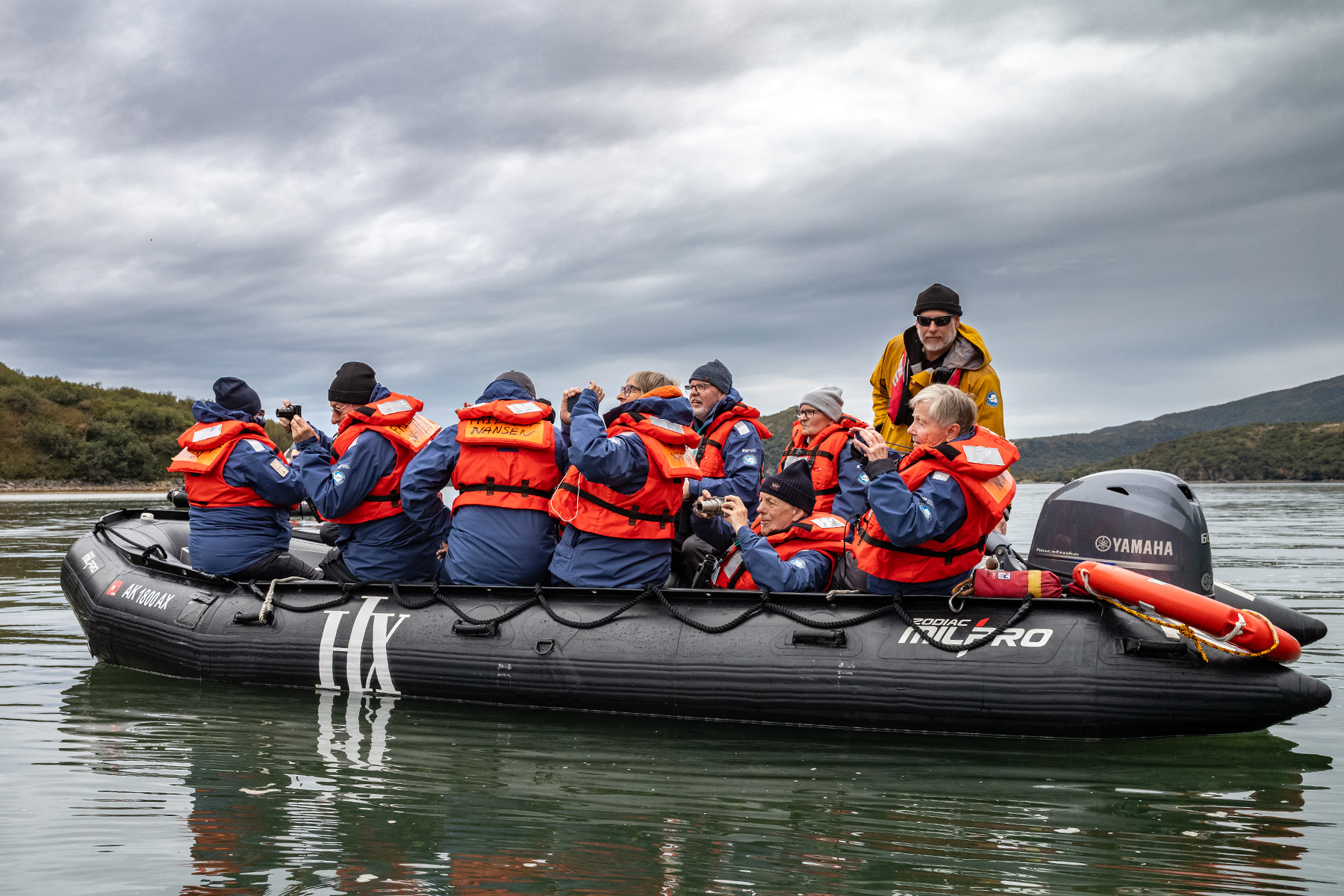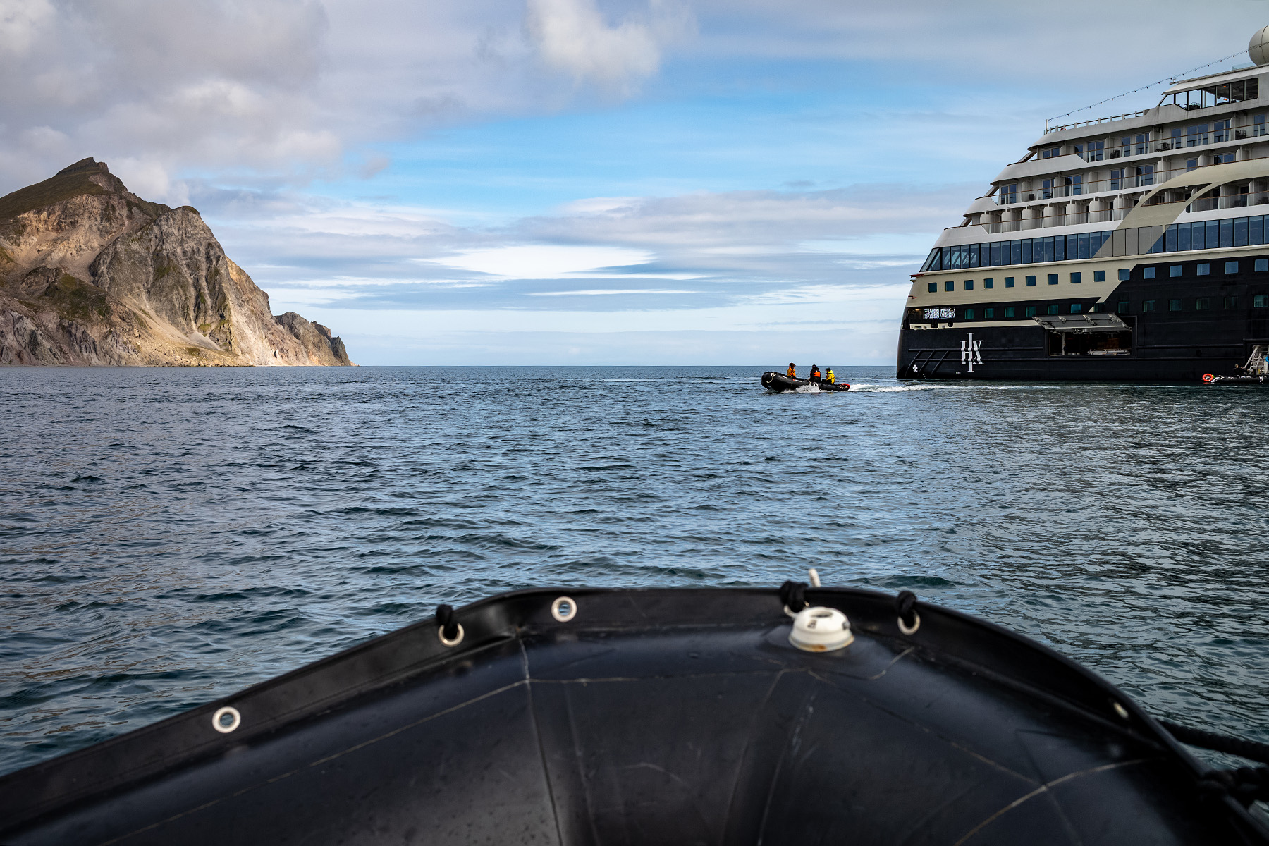 Bevor es mit dem Ausflug los geht, ist es wieder Zeit für ein paar Worte zum Schiff. Es ist sehr schön, noch ziemlich neu. Hat Platz für gesamt 530 Passagiere, wir sind aber laut Information vom Kapitän nur 313. Was sehr angenehm ist. In den Restaurants ist Platz genug, ebenso in der sogenannten Explorer Lounge auf Deck 10. Dort sind rundherum Fenster, genügend Sitzplätze verschiedenster Art. Und die Bar. Die meisten Leute lesen hier und schlafen dabei ein. Einige Frauen haben ihr Strickzeug dabei. Es ist rundum gemütlich. Außendecks gibt es ebenfalls zur Genüge. Wir haben eine „normale“ Kabine, die ist ca. 23 m2 groß. Eingerichtet ist die Kabine äußerst praktisch, mit viel Ablageplatz, Schrank, Laden, Schreibtisch. Ganz super ist das Badezimmer. Obwohl recht klein ist es sehr praktisch eingerichtet. Mit mehr Ablageflächen und Haken als in so manchem Badezimmer in einem 5-Sterne Hotel. Sogar die Dusche ist ausgesprochen groß für das kleine Bad. Und es gibt einige Haltegriffe. Das Essen ist auch nicht so übel. Keine Steirereck-Küche aber genießbar. Also merken: wer in eine kalte Gegend reisen will, sollte mit der Fridtjof Nansen fahren. Von den 311 Mitreisenden sind nun geschätzt 178 verkühlt und husten und schnupfen. Einige Tage müssen wir noch durchhalten😊. Den Pool haben wir noch nicht ausprobiert. Der Weg von 10 Metern von der Umkleide bis zum warmen Wasser ist einfach zu weit. Besonders der Retourweg. Irgendwann am Anfang der Reise habe ich gemeint, dass 2 Österreicher auf dem Schiff sind. Wir sind mehr. An die 10 Leute. Das Handhygienekonzept ist ein wenig eigenartig. Früher gab es vor dem Restaurant Desinfektionsspender, die die Leute relativ brav verwendet haben. Jetzt sind solche Spender zwar noch immer am ganzen Schiff verstreut montiert, werden selten verwendet, weil vor dem Restaurant gilt nun kontrollierte Händewaschpflicht. Auch wenn man vorher desinfiziert hat, muss man waschen. Und diese Wascherei wird recht rasch erledigt und das Wasser ist kalt. Wäre nicht das Desinfizieren gscheiter? Naja, irgendein Gesundheitsökonom wird das wahrscheinlich so bestimmt haben. Den Ausflug haben wir nun erledigt. Anlandung auf Unga Island in einer Bucht, wo die Überreste der Siedlung Unga Village zu finden sind. Die Insel wurde Ende des 18.Jahrhunderts entdeckt und dann von den Aleuten und russisch vermischten Menschen besiedelt. Bis 1958 gab es sogar ein Postamt. Die letzte Familie hat die Insel 1969 verlassen. Die Menschen hatten auch Kühe, es gibt heute noch welche. Die Hinterlassenschaften dieser Kühe haben wir gesehen, die Tiere selber haben sich wahrscheinlich wegen der Besucherinvasion hinter ein paar Hügel verzogen. Die Häuser sind natürlich alles verfallene Holzhütten, die jederzeit zusammenbrechen können. Es liegt auch noch viel Werkzeug- und Maschinenschrott herum. Vor der Anlandung wurden wir mit dem Zodiac noch zu einigen Felsen gefahren mit viel Vogelbestand. Und da zeigte sich wieder, wie unpraktisch diese Schlauchboote sind. Man kann nicht aufstehen zum Fotografieren, es schaukelt wie wild und man muss sich gut festhalten. Mit den Beinen / Schuhen schlupft man auch unter ein Seil, das am Boden gespannt ist. Man fühlt sich ein bißl wie bei Greenpeace 😊. Die Zodiacs auf unseren früheren Reisen waren da sehr viel praktischer. Hatten Sitzbänke, dadurch hat man sich am Schlauchwulst angelehnt, in der Mitte war ein Geländer zum Anhalten, da durfte man auch aufstehen, wenn das Boot langsam gefahren ist. Und das Ein-und Aussteigen war über 2 Stufen mit Geländer am Bug. Warum sie diese Boote nicht mehr verwenden, verstehe ich nicht. Weil nun kann man während der Fahrt kaum noch fotografieren oder filmen. Das geht halbwegs, wenn man vorne am Bug sitzt. Aber es ist wie es ist und der Ausflug war trotzdem gut.