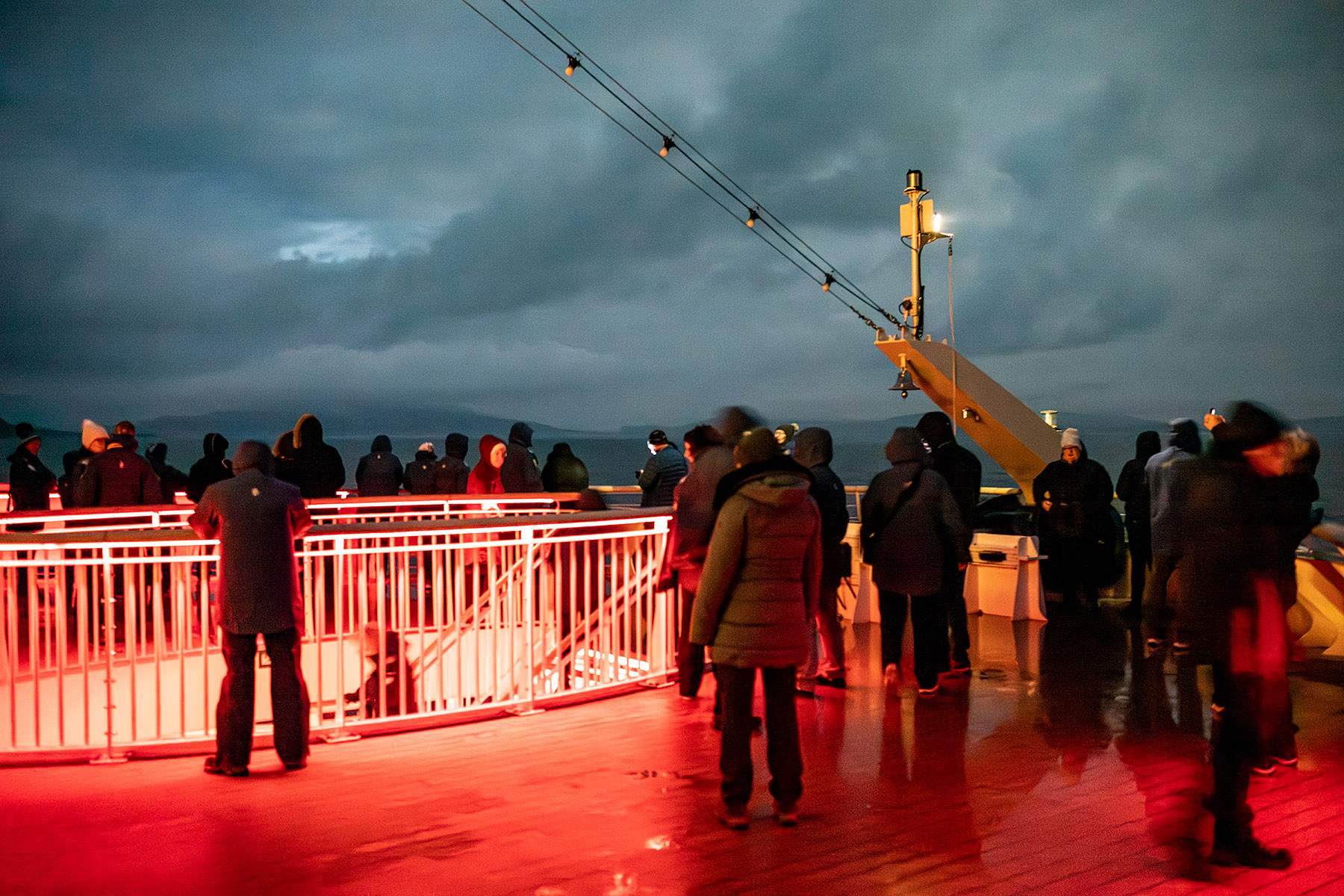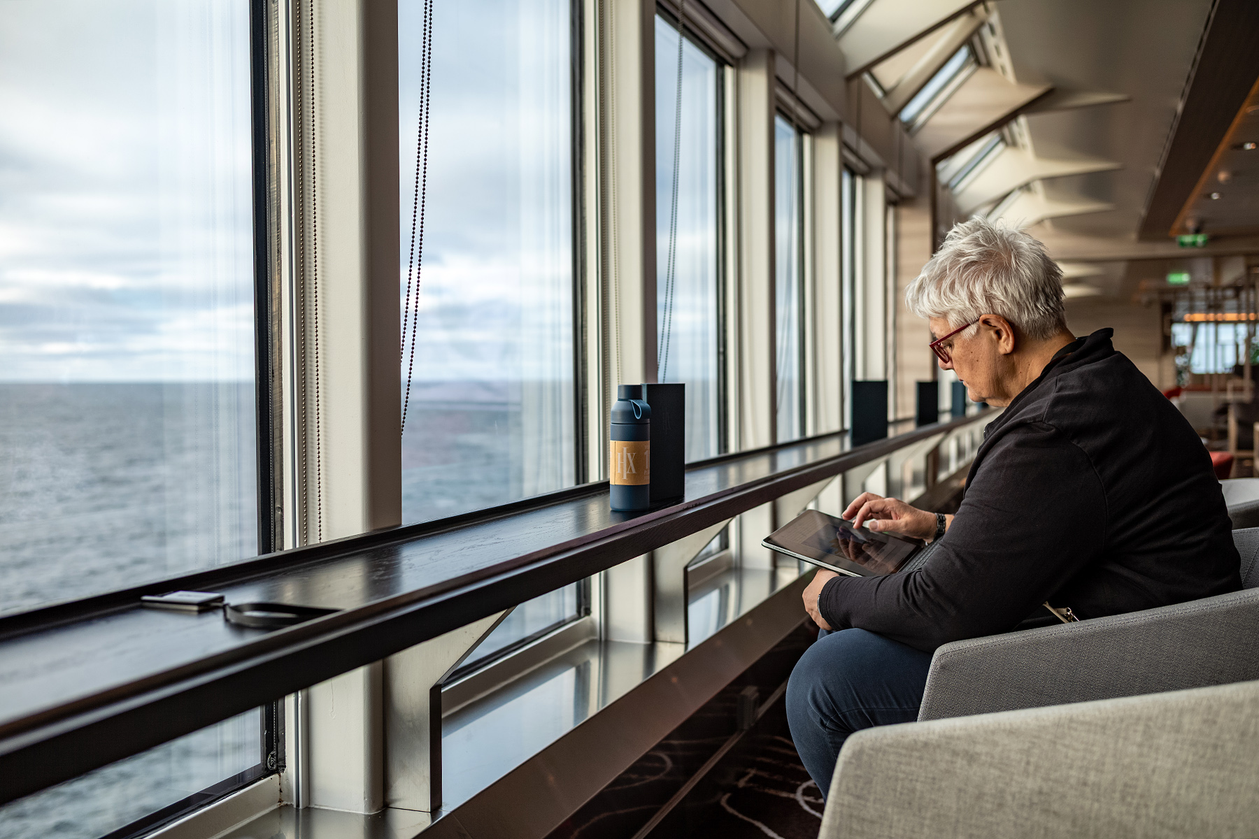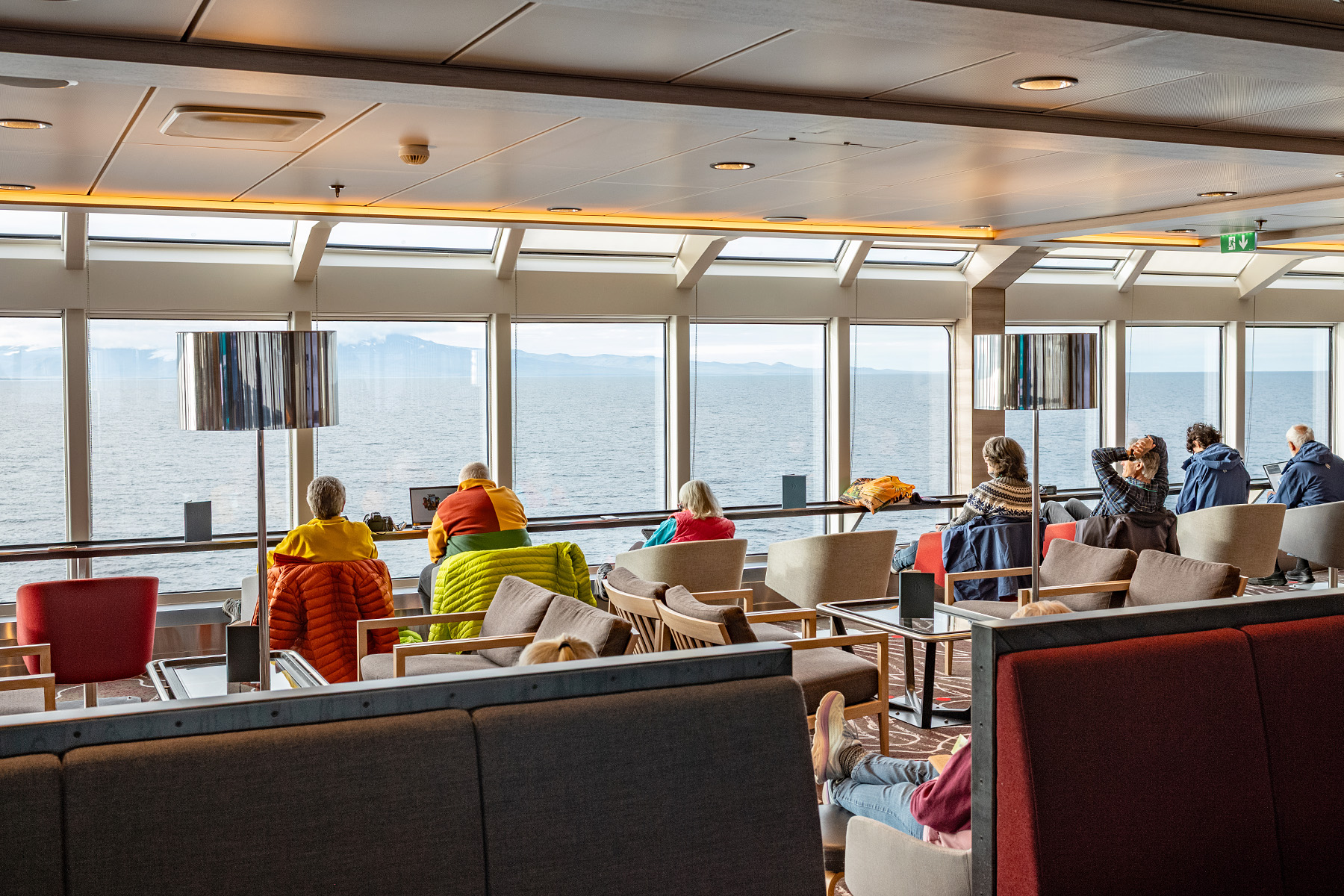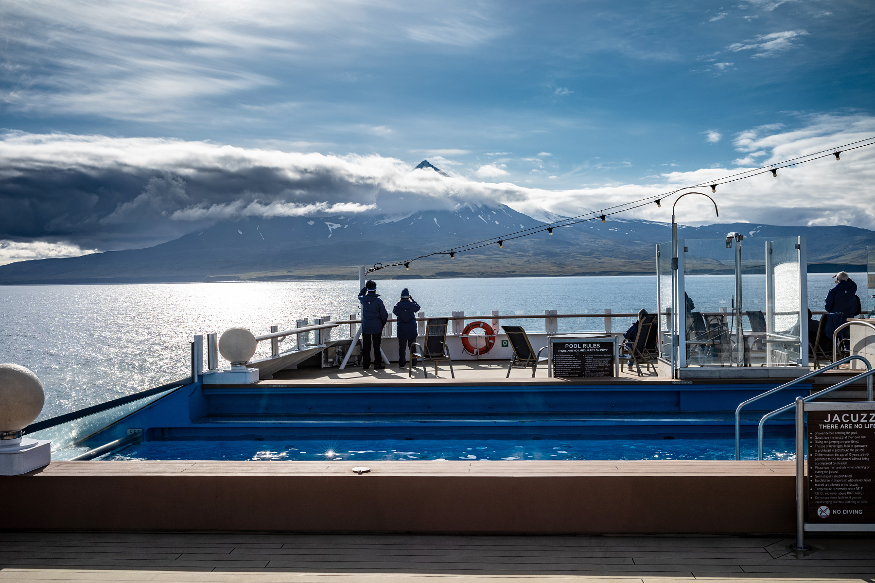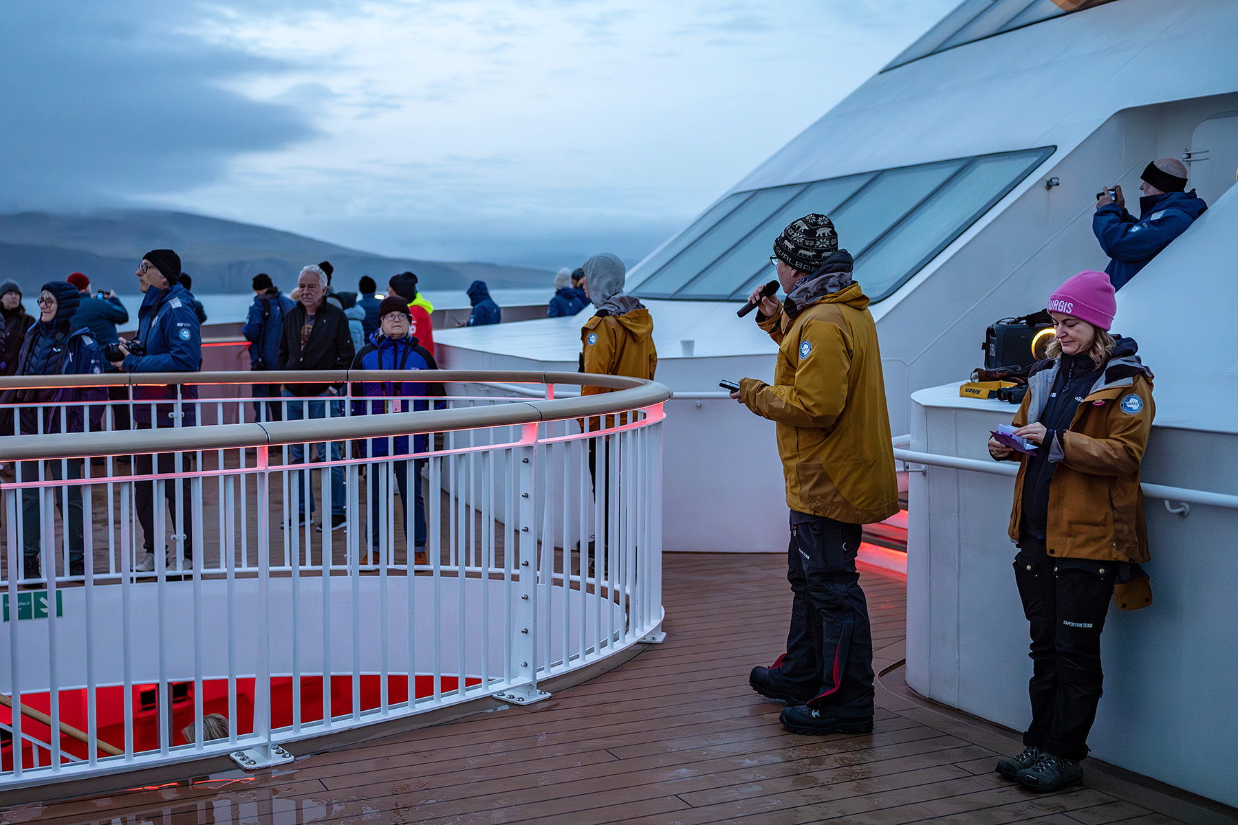 In der Zwischenzeit wieder ein paar Worte zum Schiff: wenn nix zu tun ist haltet man sich am besten auf Deck 10 auf. Dort ist die sogenannte Explorer Lounge mit jeder Menge verschiedener Sitzmöglichkeiten, einer Bar mit ausgezeichneter Hot Chocolate (man verwendet Nesquick), relativ guter Musik im Hintergrund (heute eher im Vordergrund) und hin und wieder gibt es eine Reiseverkaufsshow oder so wie gestern eine Plauder- und Fragestunde mit dem Kapitän und seinen Offizieren. Vom Deck 10 ist man auch gleich draußen beim Pooldeck (wo nur vereinzelt wer im Wasser ist), von dort schaut man quasi vom Heck aus der Landschaft hinterher. Oder man geht aufs Deck 11, wo man dann runderherum schauen und spazieren kann. Eine Laufspur ist eingezeichnet mit 150 m Länge. Und da jetzt nicht mehr viel los ist, sind viele Passagiere auf Deck 10. Manche lesen, manche schlafen, einige spielen Karten. Und etliche Damen stricken. Es wurden auch Strick-und Tratschtermine abgehalten. Irgendwie kommt mir das nun bekannt vor, ich glaube das hab ich alles schon einmal erklärt. Übrigens dürften die Kartenspieler Briten sein. Verhalten sich sehr angenehm, sind höflich und entspannt und lassen sich durch nix stören, auch nicht von einem launigen Vortrag des Wissenschaftsclown Magnus. Das ist der norwegische Sachverständige für nordische Geschichte. Schnelle Revision meiner Einschätzung: die entspannten britischen Kartenspieler sind Deutsche. Man glaubt es kaum. Es gibt doch tatsächlich etliche angenehme deutsche Mitbürger. Das Weltbild ändert sich momentan drastisch 😊.