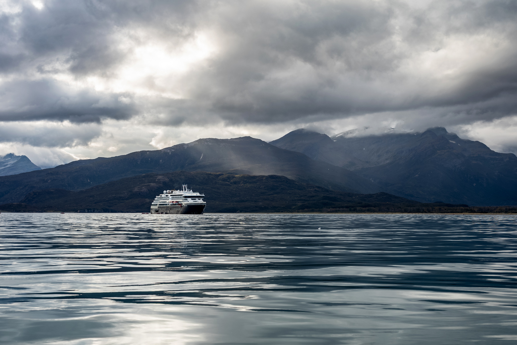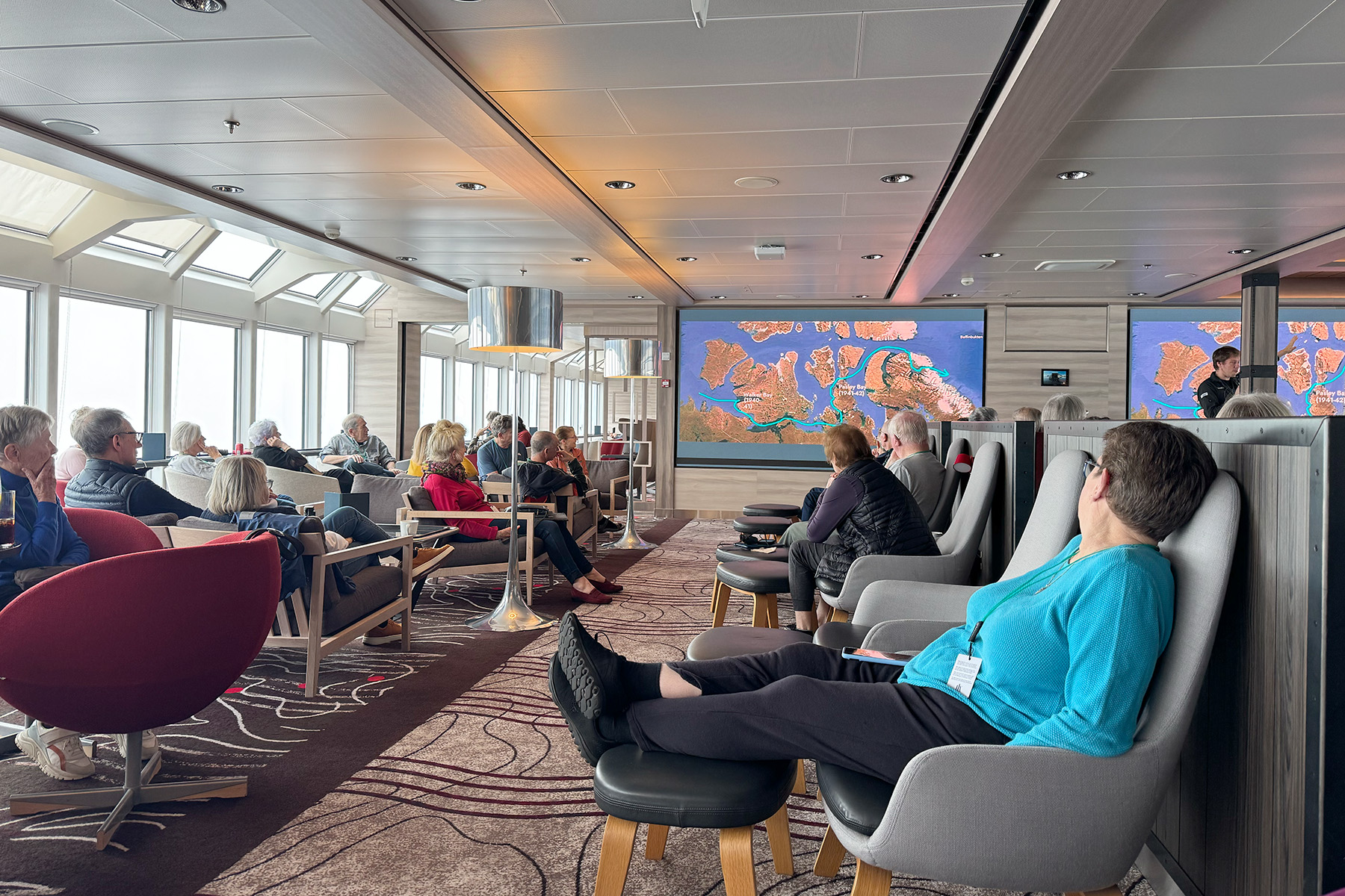 Mittlerweile ist es 15:00 und wir haben wieder einiges erledigt: Mittagessen, Stiefel für die nassen Anlandungen geholt. Jetzt haben wir bis 17:30 nix zu tun (die Einweisung in die Bedienung der Kayaks lassen wir aus😂), dann spricht der Kapitän. Aussendeck ist uninteressant, gibt ja weit und breit nix zu sehen – trotz intensiver Suche mit dem Trinovid. Die Wale sind Mitte September sicher schon weiter im Süden auf ihrem Weg in die Antarktis. In den Jacuzzis ist auch nix los. Der Infinity-Pool wurde heute früh gereinigt, wurde dann neu befüllt und jetzt wird das Wasser noch chloriert. Also bleibt Zeit, um im Internet über Dinge genauer zu recherchieren, die wir im Science Center aufgeschnappt haben. Das Science Center ist bestückt mit modernster Technologie und wissenschaftlicher Ausrüstung. Hier treffen sich die Gäste und das Expeditionsteam und schaffen ein tieferes Verständnis für die Gebiete, die bereist werden. Auf unseren früheren Hurtigruten-Expeditionsreisen waren hauptsächlich deutsche Gäste, viele Amerikaner, einige Resteuropäer, viele Asiaten und 4 Österreicher (Fuchszeit und Familie Grössing). Hier sind hauptsächlich Amerikaner, etliche Deutsche, ca. 4 Asiaten und 2 Österreicher. Und eine französische Gruppe dürfte dabei sein. Das Personal kommt hauptsächlich von den Philippinen, das wissenschaftliche Personal (das auch die Jacken und Stiefel verteilt) dürfte amerikanisch-europäisch bunt gemischt sein. Jedenfalls sprechen viele auch deutsch. Durchsagen kommen auf englisch, deutsch und französisch. Ich glaube für heute gibt’s nicht mehr viel mehr zu erzählen.