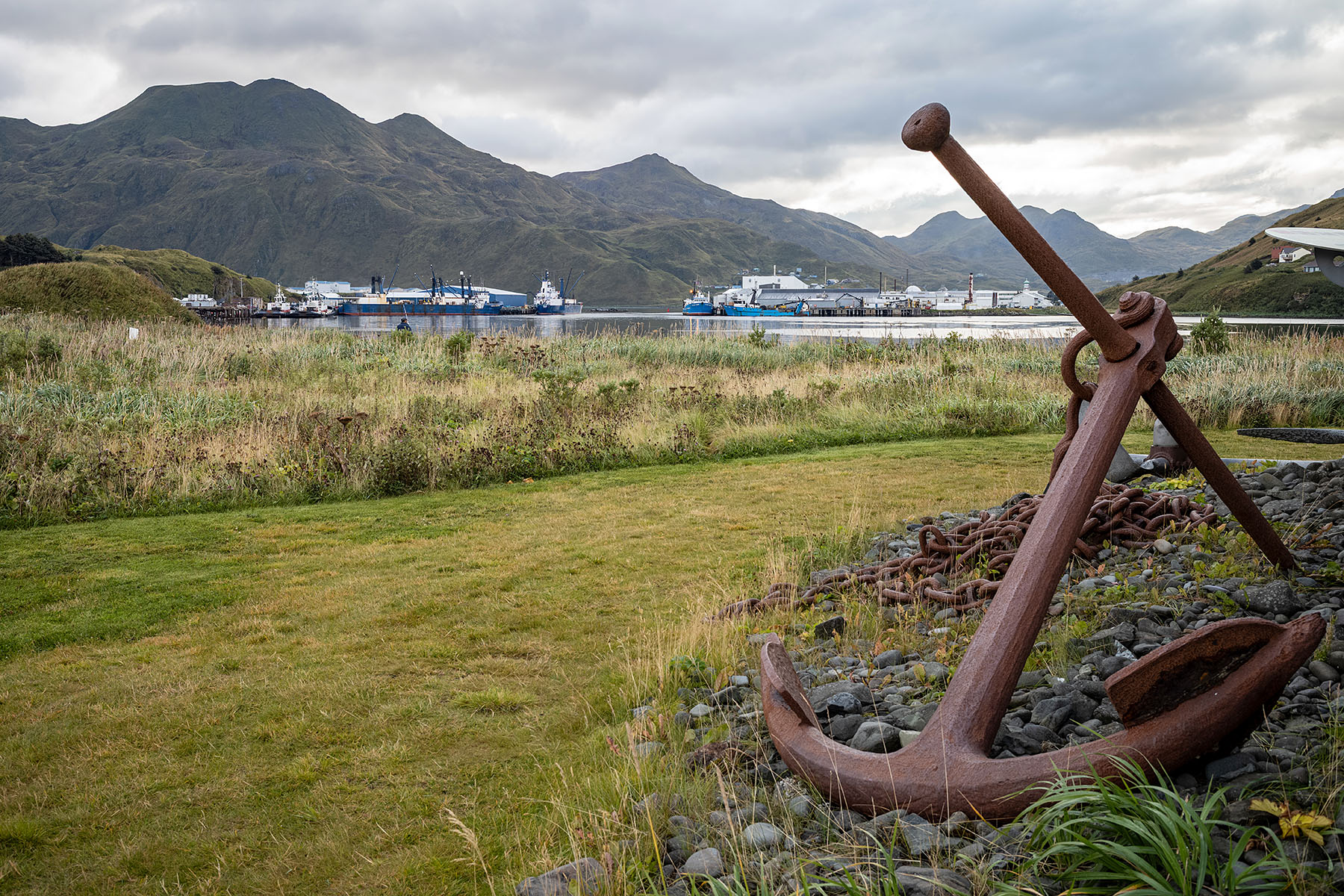 Wir sind mit 14 Knoten (=ca. 26 km/h) durch die Nacht gedüst, ohne merklichen Wellengang. Die Tsunamiwarnung wurde auch schon aufgehoben, wie wir wieder orf.at entnommen haben. Auf Unimak Island sind einige schöne, hohe, aktive Vulkane, wie eigentlich in der ganzen Gegend hier. Das Wetter ist recht gut mit Sonne und Wolken. Temperatur 10°C, was sich an Deck saukalt anspürt. Es gab mehrere Walankündigungen, was die Leute sofort aktiv werden lässt für einige Zeit. Ehrlicherweise ist aber bezogen auf Wale nicht wirklich was los. Aber man bleibt in Bewegung. Man merkt nun auch, dass die Gegend ein wenig belebter ist weil einige Boote unterwegs sind. Vielleicht Fischer, Abenteurer oder die Coastguard. Aus dem Meer ragen viele Inseln, größere und kleinere, alle mit Vulkan. Übrigens heißt Dutch Harbor deshalb so, weil das erste Schiff, das in den Hafen eingelaufen ist, ein Holländer war. Gegen 17:30 haben wir im Hafen angelegt. Das ist so ungefähr die unattraktivste Gegend für ein Kreuzfahrtschiff. Bis zum Zentrum sind es gute 3 km, dazwischen liegt noch der Flughafen. Heute Abend gibt es einen geführten Spaziergang, den werden wir uns anschauen. Für Morgen sind einige Shuttlebusse geplant, die uns auf Etappen zum Zentrum bringen und wieder retour. Was wir heute schon gelernt haben: auch hier hat sich der 2.Weltkrieg abgespielt. Es gibt noch Bunker-Anlagen. Im Juni 1942 haben die Japaner ungefähr 70 Bomben abgeworfen. Heute kämpfen die Krabben hier ums Überleben. Sie werden in riesigen Körben über einige Tage gefangen, hochgezogen, vermessen und überprüft ob Männchen oder Weibchen. Wenn sie zu klein oder Weibchen sind, werden sie ins Meer zurück geworfen (ich frage mich, ob die Viecherln psychologische Betreuung haben). Die anderen werden entweder sofort tiefgefroren oder kommen als Lebendtransport zum Wirten. So schauts aus.