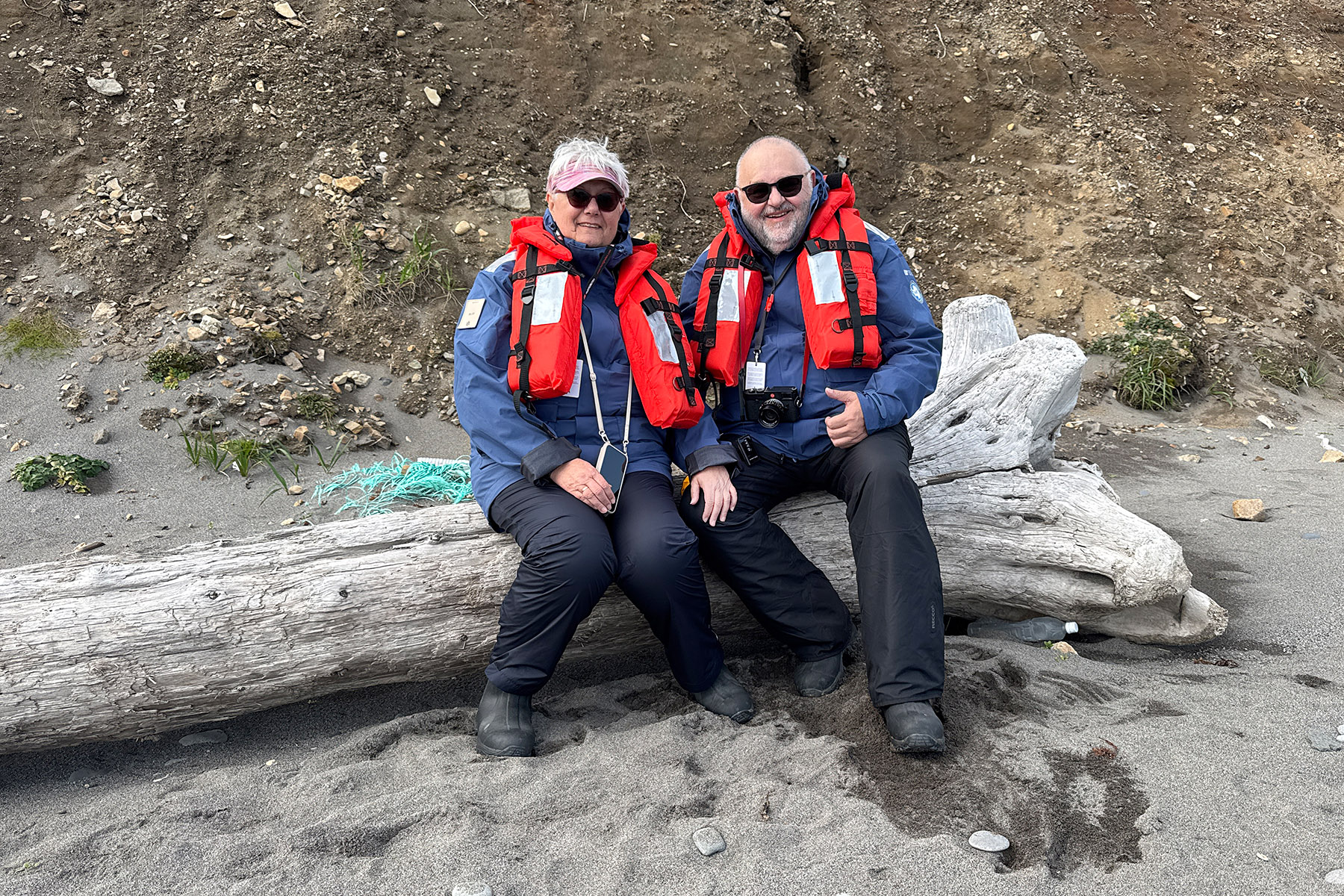 Terminplan: 07:30 Umrundung der Insel mit Stop vor einem Vogelfelsen und Beobachtung der Vogelbrutstätten. Gleichzeitig 07:30-09:30 Frühstück. 11:30 Mittagessen für die Blauwale (kurze Erinnerung, wir sind die Gruppe Blauwale). 12:30-14:00 nasse Anlandung der Blauwale. 15:30-16:00 Zodiac-Fahrt der Blauwale. Nasse Anlandung bedeutet, dass das Schlauchboot am Strand anlegt und wir auf jeden Fall einen oder mehrere Schritte durch das Wasser gehen müssen. Deshalb ziehen wir eine Hose an, die in den Gummistiefeln steckt und eine Regenhose darüber und die gestern ausgegebenen Wind-Regenjacken. Über das Ganze noch eine leuchtend orange Rettungsweste. Fertig ist das bunte Michelinmaxerl. Die Reihenfolge der verschiedenen Tiergruppen bei den Ausflügen wechselt. Heute sind wir eher im späten Mittelfeld, morgen vielleicht die erste oder letzte oder mittlere Gruppe. Das System ist nicht so schlecht. Nun ist es 07:00, draußen stockfinsterdunkel und ab 07:30 sollen wir den Vogelfelsen und das verrostete Schiffswrack zu sehen bekommen. Wir werden sehen, ob wir was sehen😊. In der Tages App sind alle Vorkommnisse und geplanten Aktivitäten angeführt. Da ist über Nacht für heute einiges dazugekommen: Kunstworkshop „Gestalte deine Trinkflasche“, Technikworkshop „Installation und Erklärung der App iNaturalist zur Bestimmung von Blumerln und Tieren“, Workshop „Asche zu Asche“ (wie wird aus Vulkanasche und Lava Stein), Vortrag „der Vogelzug“ und ganz zum Schluss ein Kurzvortrag über Füchse in der Polarregion (die sollen einfach mich fragen 😂). Also das ist ganz und gar kein Urlaub, weil dazwischen sind ja unsere Anlandungen und ein bisserl was essen werden wir wohl auch. Nicht zu vergessen, dass ab späterem Nachmittag in der Bar der Pianist live aufspielt. Die geplanten Beobachtungen um 07:30 haben natürlich nicht funktioniert, es war stockfinster, trotzdem war das Deck voller Leute – wir waren natürlich auch dabei. Also kein Vogelfelsen und kein Wrack. Jetzt ein paar Bemerkungen zu den Fotoausrüstungen: es gibt sauteure Modelle mit 70 cm langen Objektiven, dann wird’s immer kleiner aber trotzdem noch groß und teuer und zum Schluss sind da die Handyknipser. Manche schleppen einen 15 kg schweren Fotorucksack mit sich rum. Ich meine halt, wenns finster ist, nutzen die 15 kg Ausrüstung auch nix, der sieht das Schiffswrack genauso wenig wie die Handyknipserin. Und schon haben wir unseren Ausflug erledigt. Aus irgendeinem Grund wurden die zusätzlichen Zodiacfahrten gestrichen und dafür die Fahrt zur Anlandestelle verlängert, um den Vogelfelsen herum. Wahrscheinlich sind sie drauf gekommen, dass sich alles nicht ausgegangen wäre. Und wir haben nun endlich einmal Papageientaucher gesehen, hunderte. Und viele Kormorane und viele andere. Die nasse Anlandung auf der Insel war ja recht lustig, aber lieber wäre mir doch eine trockene Anlandung, weil man da nicht so viel anziehen muss. Die Gummistiefel sind auch nicht sehr bequem. Die Insel ist recht groß, ziemlich grün vom Moos und Gras. Bäume gibt es nicht, nur angeschwemmtes Holz vermutlich aus Sibirien. Schöne Steine in allen Farben und ein bißl Plastikmist ist auch dabei. Das Expeditionsteam hat sich auf dem Gelände weit verstreut positioniert. Bis dorthin und dazwischen darf man sich bewegen. Man darf keinen Mist liegen lassen, aber auch keinen Mist aufklauben, man darf keine Pflanzen zertreten oder gar mitnehmen, kein Holz und keine Steine mitnehmen. Man darf eigentlich nur schauen und fotografieren. Aber man steht in einer Welt, die ziemlich einsam und verlassen ist und wo sicherlich noch nicht viele Menschen waren. Für uns persönlich ist St. Matthews der westlichste Punkt an dem wir jemals waren, W172° 54`. Mit dem Wetter hatten wir heute viel Glück. Es war bewölkt aber doch recht sonnig. Der Kapitän sagte was von 9°C. Es geht natürlich ständig der Wind und die Fahrt mit dem Zodiac war recht frisch. Nun hätten wir eigentlich Zeit, mit unseren Trinkflaschen zum Kunstworkshop zu gehen 😂.