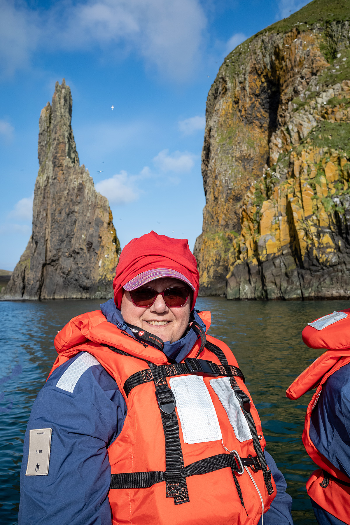 Die Nr. 4 klingt wie aus Österreich und ist eine arme Maus, weil sie auf den Zodiacs immer, also wirklich immer, in der Mitte zu sitzen kommt und deshalb nix sieht, keine Fotos machen kann. Hat immer nur blau/orange vor ihren Augen (das sind unsere Jacken mit den orangen Schwimmwesten). Es gibt halt auf dem Zodiac nur 2 wirklich gute Plätze und die sind ganz vorne. 12 Leute werden ins Boot gesetzt. Also geht es 10 anderen auch so. Aber man arrangiert sich mit den Nachbarn, bückt sich, lehnt sich einmal weiter vor oder zurück. Nr. 4 matschkert halt.