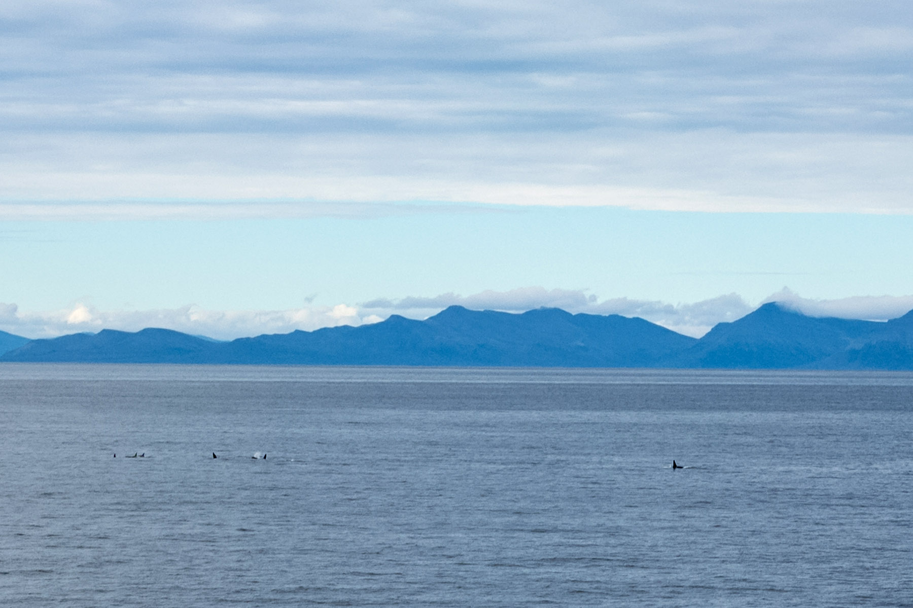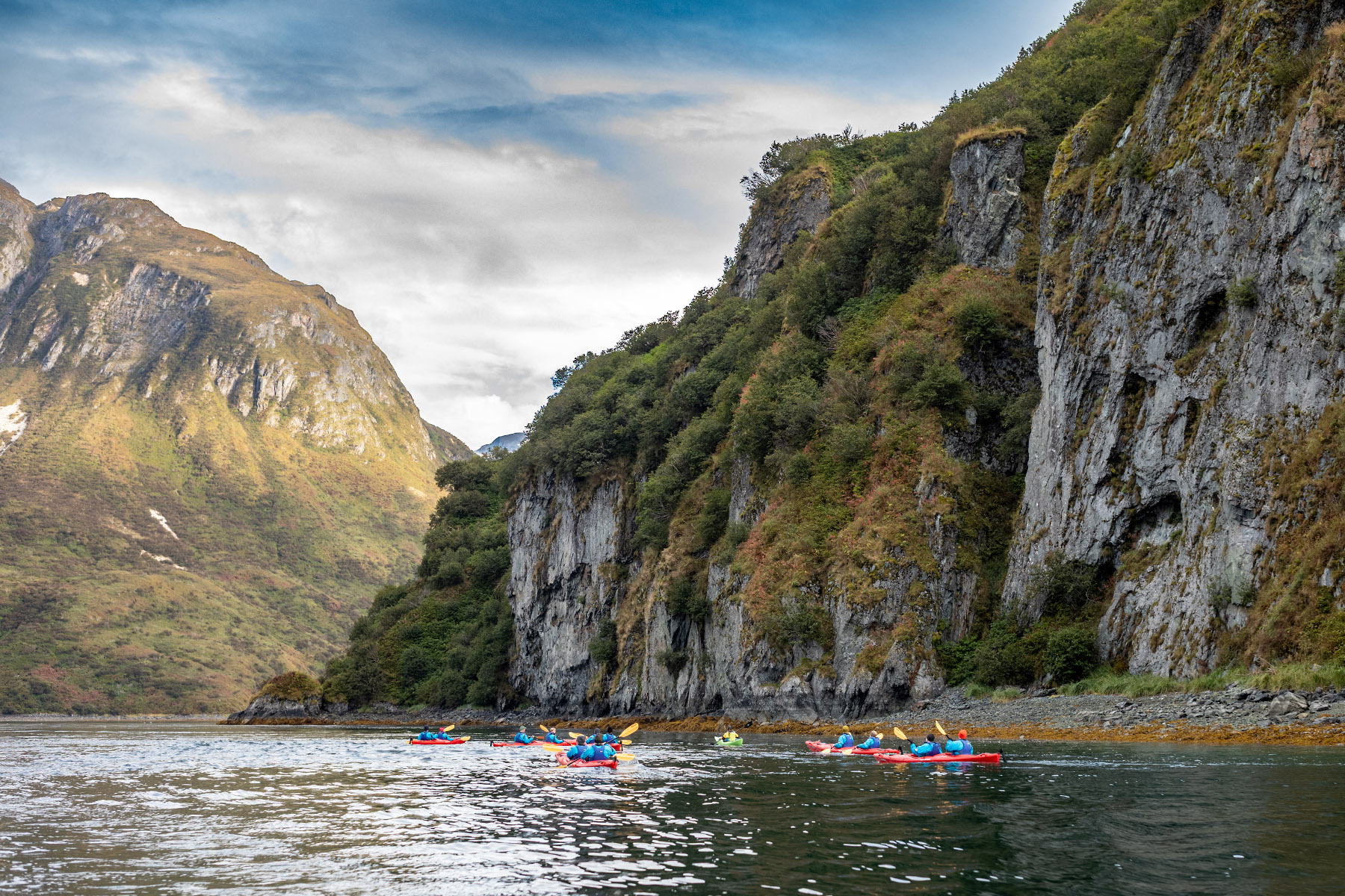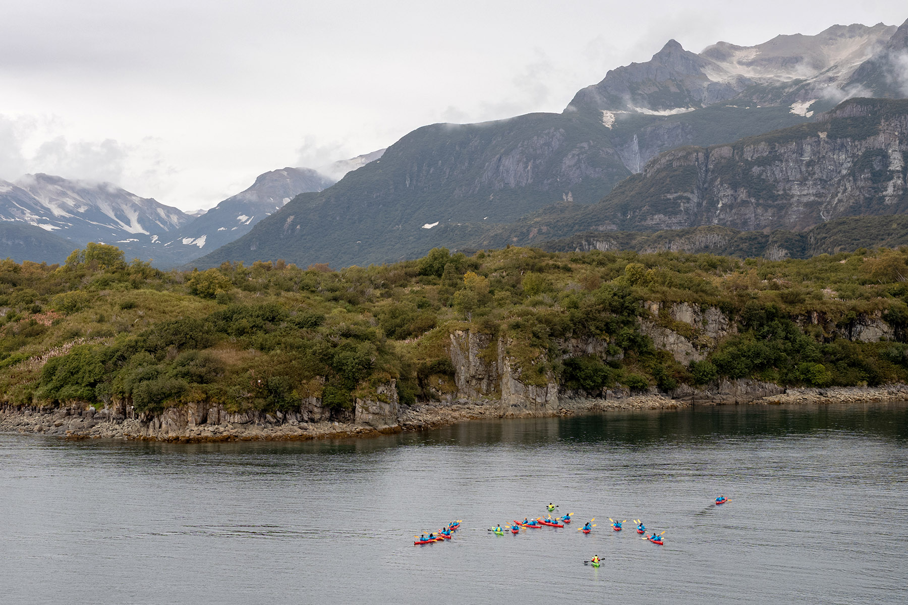 Backbord haben wir die Alaska Halbinsel, Steuerbord haben wir Kodiak Island. Die Wolkendecke zieht leider immer mehr zu. Unser Ausflug (wir sind ja die Blauwale) ist für 16:15 geplant. Hoffentlich sehen wir noch was. Vorher wird noch schnell das Pool genutzt. Jedenfalls kurz vor Mittag gab es wieder einmal Walsichtung. Diesmal aber richtig gut und noch relativ nahe. Wenn die Durchsage von der Brücke kommt und bis man fürs Aussendeck angezogen ist sind die Wale meist schon wieder ½ km weg. Wir fahren einfach zu schnell. Aber 2 kleine Pünktchen sieht man auf den Fotos. Kurz nach Ankunft in Geographic Harbor durfte die Kajak-Gruppe loslegen, alle waren sichtlich top motiviert.