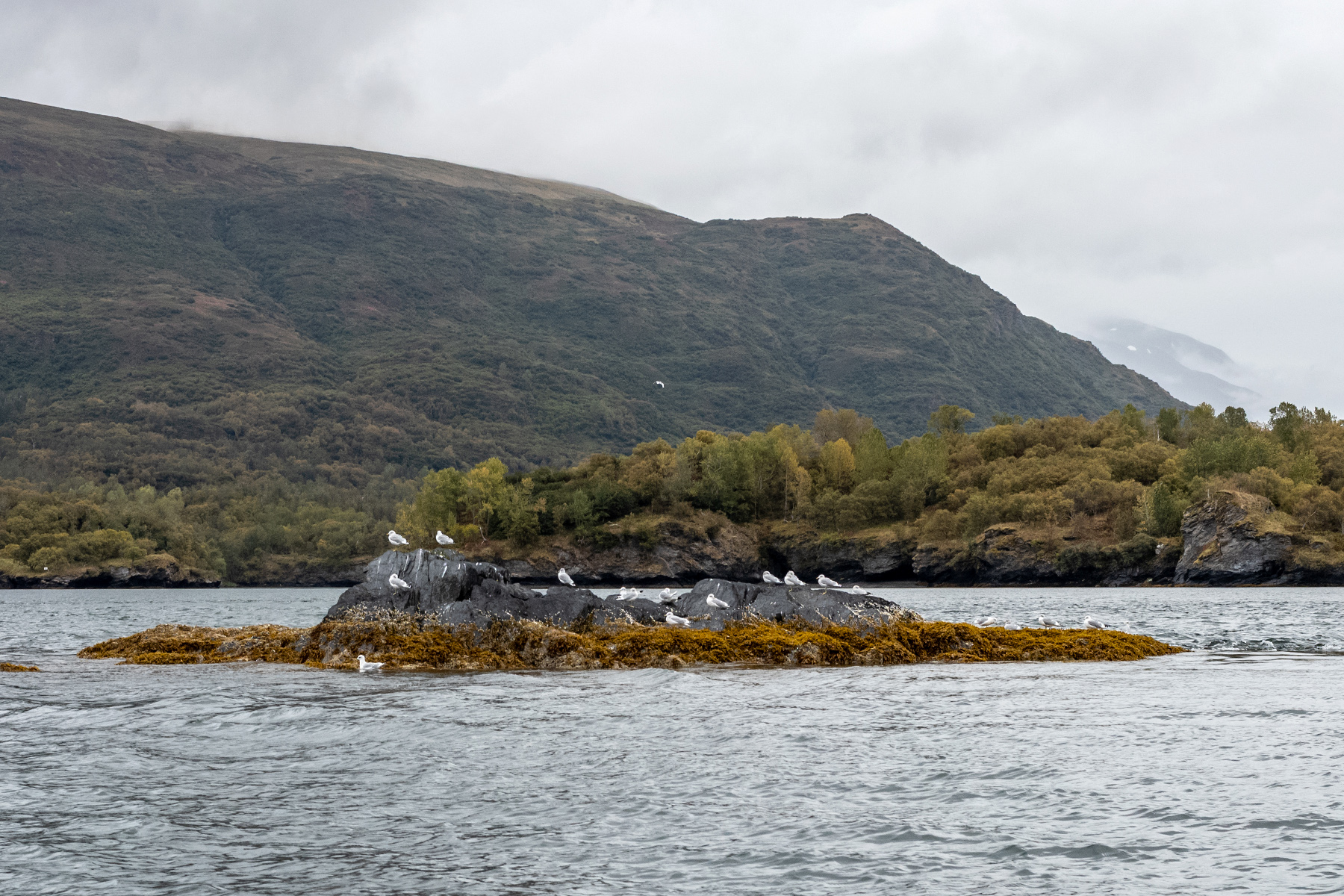 Und nun ist auch die Ausfahrt am Nachmittag vorbei. Wir haben gesehen: 1 Bär (relativ weit weg), 4-5 Seeotter, viel Fluggetier und bizarre Küstenformationen. Das Wetter war sehr gut und wir haben ein bissl was gelernt. z.B. dass Bären mit 4 Knoten schwimmen können und das über eine längere Zeit. Das heißt mit 7 kmh einige Tage lang. Und sie fressen nicht den ganzen Lachs, sondern nur den Kopf (bzw. das Hirn), die Eier und die Haut, weil das die fettreichsten Teile sind. Der Rest wird gnädigerweise anderen Tieren zur Verwertung überlassen. Morgen sollten wir große Bären zu sehen bekommen, weil wir vom Festland wieder einmal zu einer Insel fahren. Und zwar nach Kodiak Island. Aber der heutige Tag war wieder ein guter Tag.