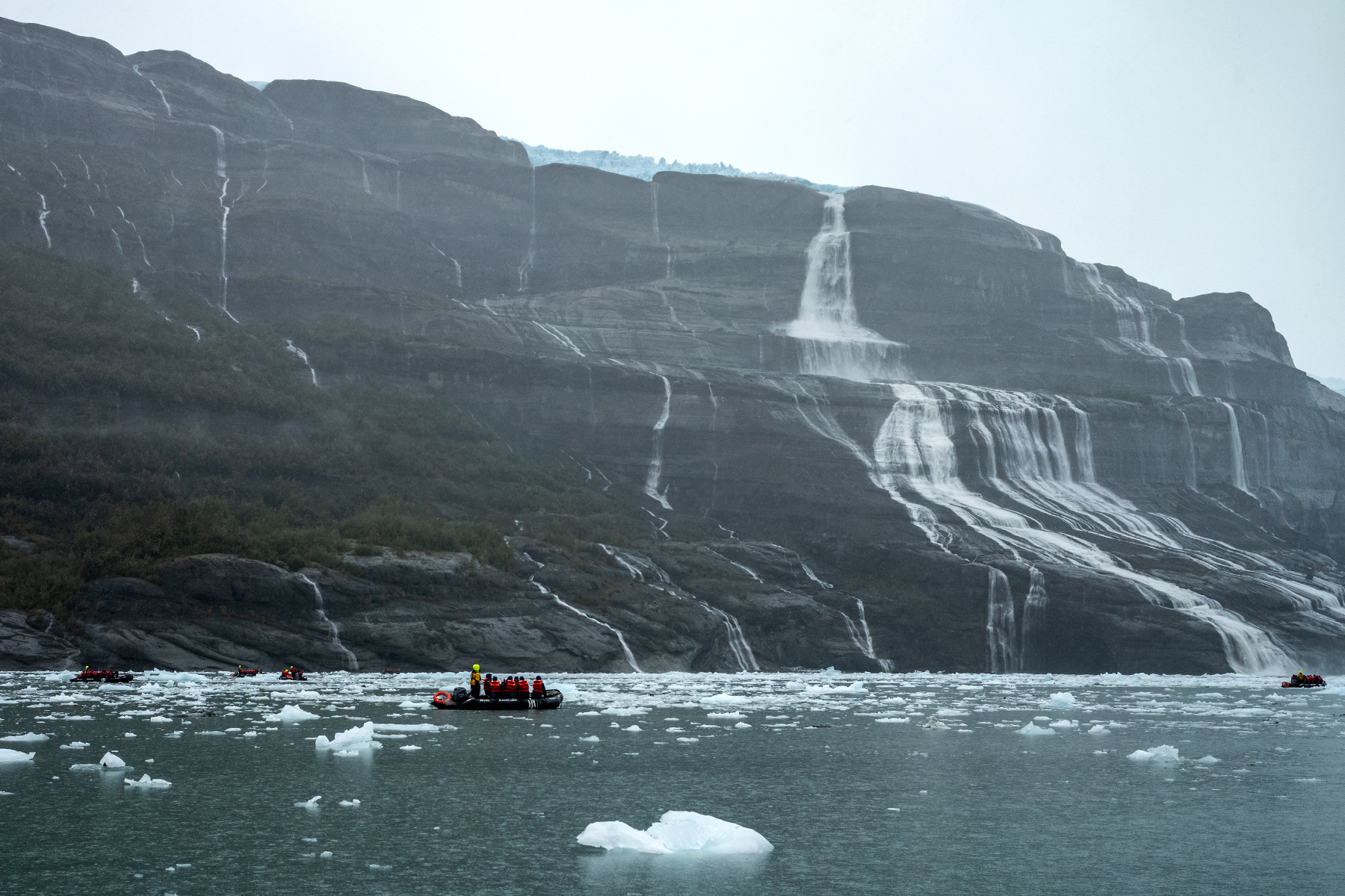 Ich würde der Gegend heute eher den Namen Rainy Bay geben. Es müssen Salzburger hier sein, wir haben richtig schönen Schnürlregen. Die Ausfahrten werden natürlich durchgeführt. Eine Fahrt dauert eine Stunde. Wir sind gut ausgerüstet, die Regen/Wind-Jacken halten dicht, die Regenüberhosen und Wanderschuhe auch. Fotografiert wird nur mit dem Handy, alle haben ihre teuren Kameras wasserdicht eingepackt. An den Brillen rinnt der Regen runter und die Handschuhe sind zum auswinden, die Handyhüllen sind durchweicht. Aber es war ein sehr guter Ausflug. Wir ankern in der Icy Bay in der linken Bucht (von insgesamt dreien) vor dem Guyot Gletscher, der sich 3-teilig in die Icy Bay hinunterschiebt. Es war eine sehr interessante Fahrt mit den Zodiacs zwischen den Eisschollen durch. Ein bißl kalt, aber da muss man durch. Eigentlich hätten wir von hier aus auch den Mount Elias sehen müssen. Mit c. 5.500 m einer der höchsten Berge von Kanada und USA (wenn die Karte nicht täuscht, geht die Ländergrenze genau durch den Gipfel). Wie gesagt, das ist nicht der höchste Berg aber irgendwie der bekannteste. Wahrscheinlich wegen der längstens Schiabfahrt der Welt, die bis zum Meer führt. Servus TV hat dazu sicherlich schon etliche Extremsport-Dokus gebracht. Ja also, den haben wir wegen dem Nebel und dem Regen natürlich nicht gesehen. Wieder ein nicht garantiertes Versprechen. Wir werden noch eine Liste anlegen müssen 😊. Die Kabine haben wir dann mit der nassen Überbekleidung ausgelegt. Die Handytascherl liegen am Badezimmerboden, der sehr warm ist, zum trocknen. Das Menschenstudien-Projekt geht natürlich auch weiter. Wir haben heute unsere Nr. 5 gefunden. Eine ungeduldige deutschsprechende vermutlich Amerikanerin im geschätzten Alter 80+ (wenn man nach den Falten im Gesicht geht). Ihr Verhalten während der Zodiacfahrt zu erzählen, würde zu lange dauern. Sie wäre aber ein gutes Studienobjekt gewesen für unseren Seelenforscher Dr. Erwin Ringel. Natürlich gibt es auch viele nette, angenehme Mitreisende. Ein Ehepaar aus Regensburg z.B. ist dermaßen tiefenentspannt, beneidenswert. Und mir begegnen sowieso jeden Tag Leute, die ich noch nie gesehen habe, die mir aber wahrscheinlich schon zigMal begegnet sind. So ein Schiff ist auf jeden Fall ein interessanter Ort. Seit wir nun aus der Icy Bay wieder draußen sind, ist der Wellengang wieder „motion in the ocean“. Das taugt unserem Kapitän sichtlich. Sogar die Sonne wagt sich durch die Wolken. Hoffentlich bleibt das so bis morgen, aber wir sind noch einige Hundert Kilometer vom nächsten Ziel entfernt. 2 Ausflüge haben wir noch, die sollten schon ohne Regenwetter über die Bühne gehen. Übrigens ist heute Abend Karaoke – wird leider ohne uns stattfinden😂. Dafür haben wir uns einen Vortrag über Plankton-Forschung angehört. Die Frau Dr. Katharina hat uns schon mehrfach bei Zodiacfahrten als Deutsch-Dolmetscherin begleitet und erzählt, dass ihr Fachgebiet Plankton ist. Man glaubt ja gar nicht, wie interessant das sein kann. Bisher war uns Plankton relativ egal. Ja eh, gibt es, und sonst? Aber ohne diese Winzlinge könnten wir gar nicht leben. Was jedoch ab heute in unserem Leben fehlt, ist das „Wimmerl“, ein GPS-Tracker von Franz. Ein Vorgänger fährt in einem Bus in Indien herum, der Nachfolger fliegt in einem Handgepäcksfach um die Welt und der letzte ist heute in der Icy Bay im Regenwasser verstorben. Wie die Reise nun ohne Wimmerl weitergehen wird, ist sehr fraglich. Ohne Wimmerl hat alles keinen Sinn 😉