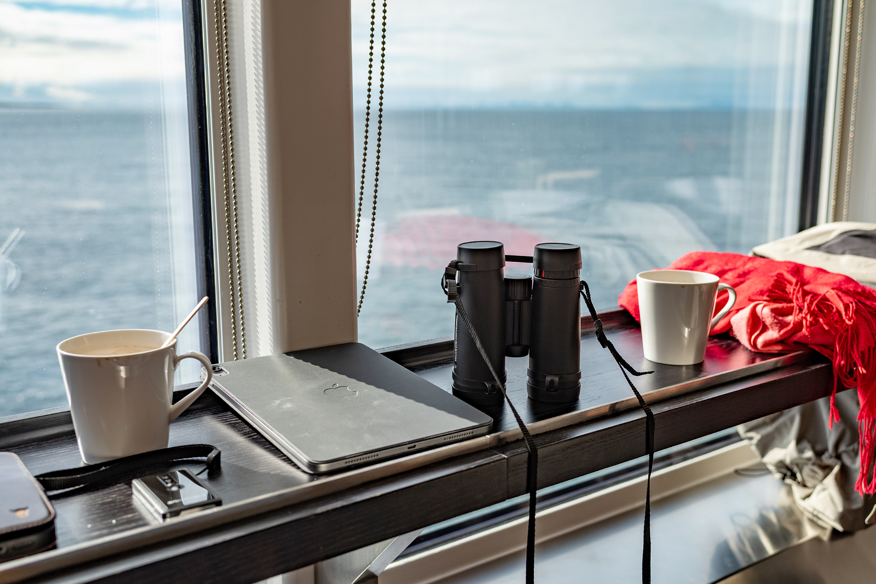 Heute ist Seetag und daher wieder an der Zeit über das Schiff zu schreiben, bzw. über das Leben auf dem Schiff. Es gibt nicht wirklich etwas auszusetzen. Die Crew ist perfekt, freundlich, kompetent. Die Lektoren alle Experten auf ihrem Gebiet, die das auch recht gut vermitteln können. Das Angebot, sich über den Tag zu beschäftigen ist ebenfalls ausreichend und gut. Es ist halt alles auf ein bisschen Wissenschaft aufgebaut, aber durchaus interessant und kurzweilig. Vorträge dauern zwischen 30 und 45 Minuten. Und dann sind natürlich die bestens organisierten Landgänge oder Zodiacfahrten in den Buchten. Alles sehr gut, keine Klagen. Was wir als Hurtigruten-Wiederholungstäter halt bemerken ist, dass die deutsche Sprache immer mehr in den Hintergrund tritt, obwohl deutsch eine der 3 Bordsprachen ist. Auf den früheren Reisen gab es die Vorträge in einem Saal auf deutsch, im Nachbarsaal auf englisch. Jetzt sind sie durchwegs auf englisch und für Deutsch kann man Ohrenstöpsel bekommen durch die dann eine Dolmetscherin (ist meistens ein Mädl) spricht. Das ist nicht so gut, weil man einerseits den Originalton hört und andererseits nicht jedes Mädl gleich gut übersetzen kann. Es gibt hier an Board eine Simone aus Linz, die macht das sehr gut, übersetzt auch ins Französisch. Die kann aber natürlich nicht immer dolmetschen. Diese Situation macht die Vorträge dann etwas schwierig, weil wenn z.B. der Vogelkundler enthusiastisch über die Vogelwelt referiert, wissen wir eher nicht von welchem Viecherl er grad so schwärmt. Wir sehen zwar das Foto und hören den englischen Namen aber …… eben. Das ist ein bissl schade, aber uns geht’s hauptsächlich eh um die Gegend. Den Rest fragen wir Dr. Google.