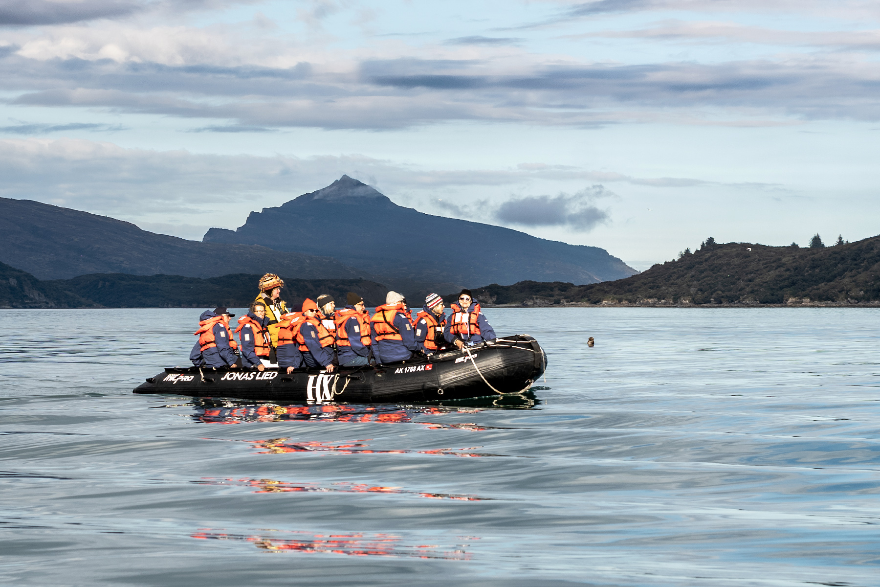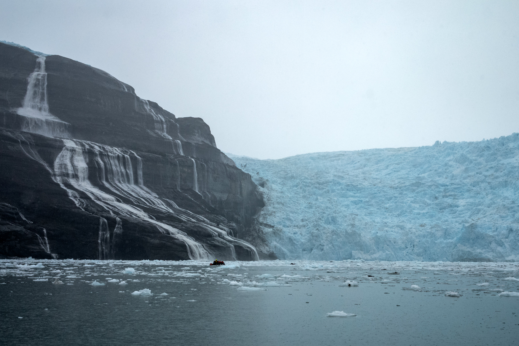 Am Vormittag, eigentlich noch in der Früh, knapp nach Sonnenaufgang mussten wir Blauwale schon raus zum ersten Ausflug. Eine einstündige Zodiactour im Fjord. Hier soll es viele Bären geben, während der Fahrt waren leider keine zu sehen (die wollen halt auch nicht immer), aber kurz vor Abfahrt kam die Durchsage von der Brücke, dass 2 Stück auf Steuerboard herumstreunen. Dafür haben wir während der Fahrt einige Seeadler, 2 Robben, 1 Fuchs, einige Quallen und viel Fluggetier gesehen. Und ganz beeindruckend war die Landschaft in der Früh. Das Wasser spiegelglatt (bevor die Boote mit uns drüber gedüst sind), ein paar Nebelfetzen an den Bergen. Hier kann man nur mit einem Schiff / Boot herkommen und dafür braucht man von irgendeinem Amt eine Erlaubnis. Die Kajakfahrer sind bei ihrer Ausfahrt 3 Stunden unterwegs und kommen natürlich viel näher an die Küste heran. Das Problem wäre halt, ins Kajak würden wir eh hinein fallen aber heraus nicht mehr 😂.